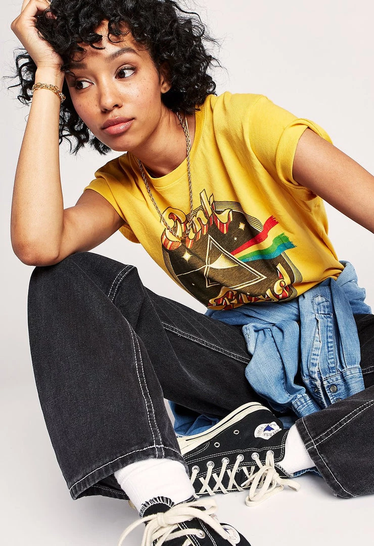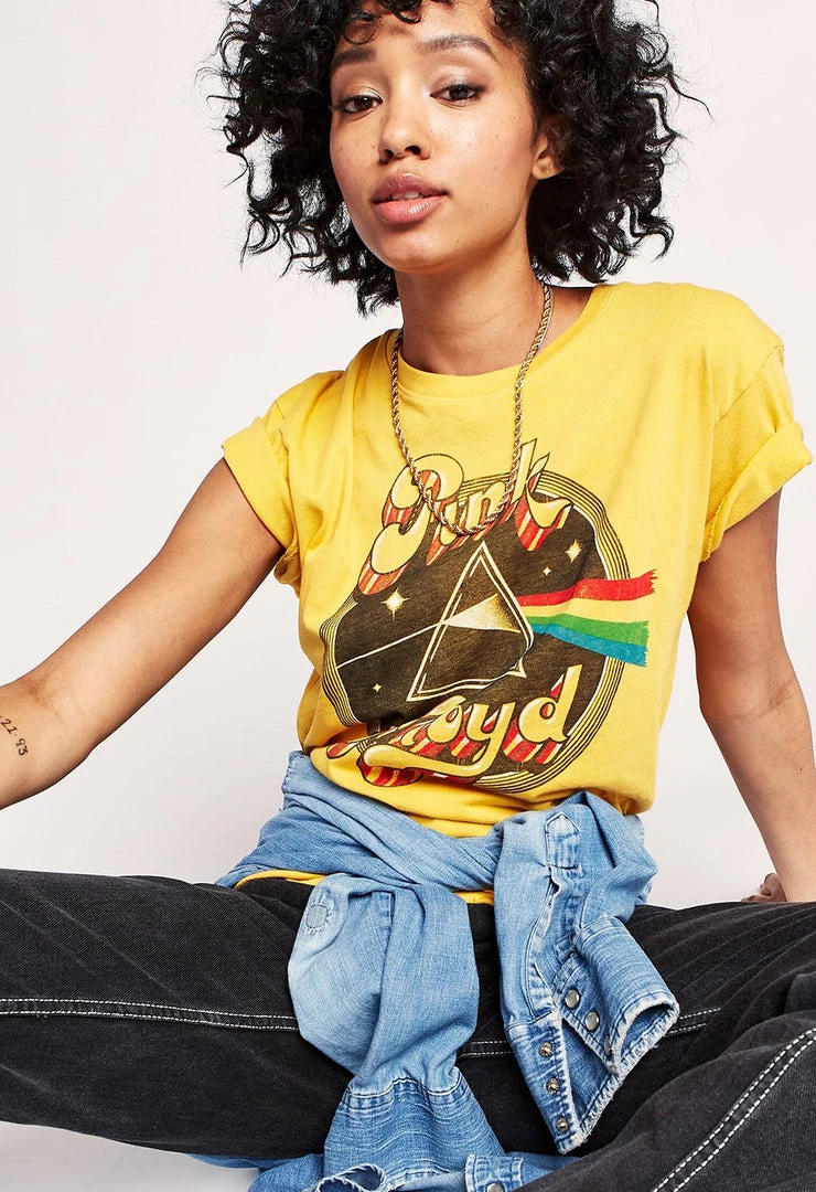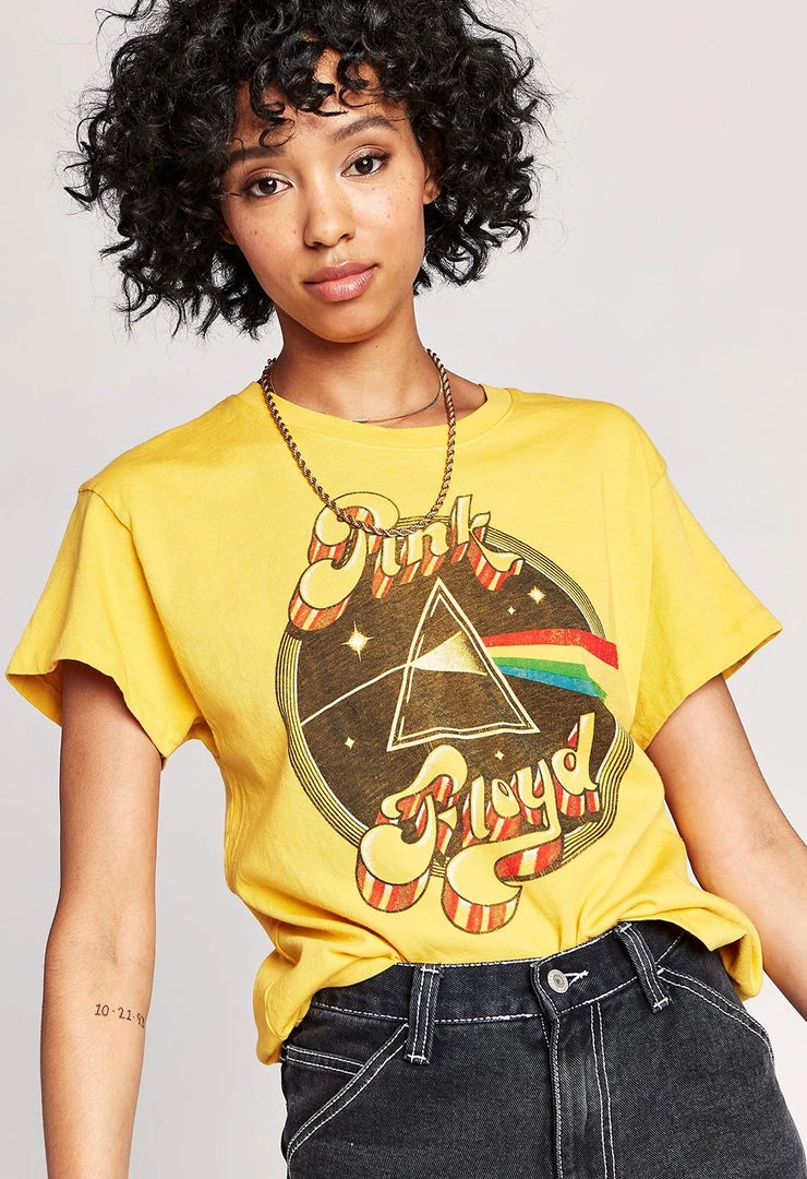 This marigold vintage inspired Pink Floyd features their iconic prism, known to transform white light into all different shades of color. Reflective of the transformation we feel when we turn on our favorite Pink Floyd song.