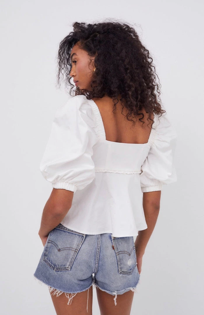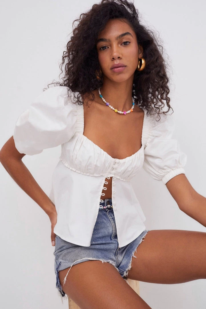 Breezy poplin top featuring a feminine shirred drawstring bust and buttons along the front.