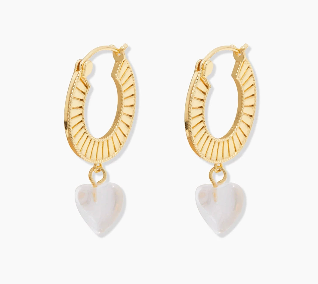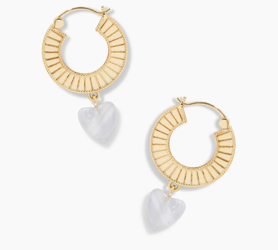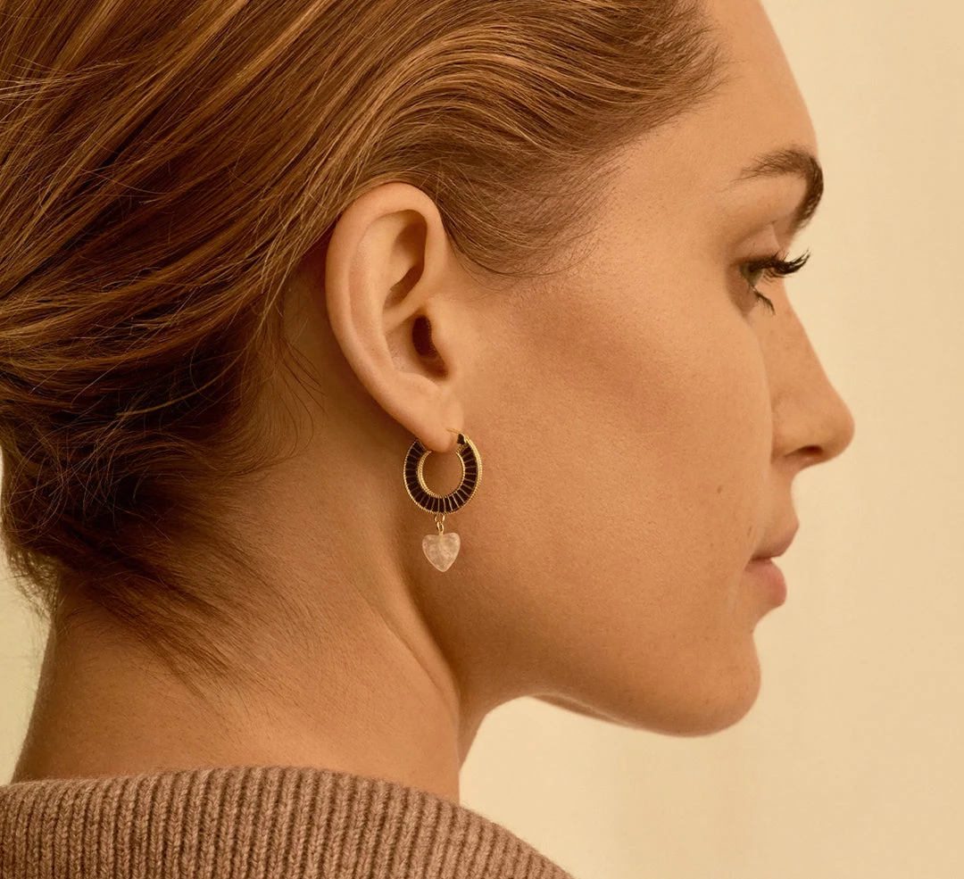 To be totally transparent, we love the way these clear crystal quartz hearts dangle from these textured profile hoop earrings. This earring looks best when worn in your first piercing.