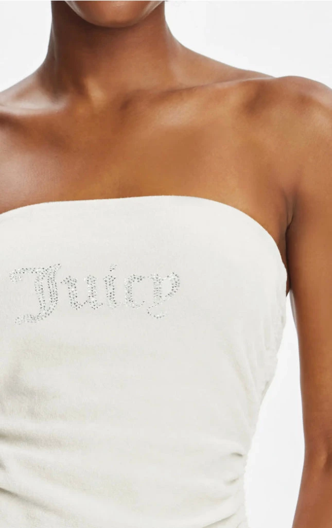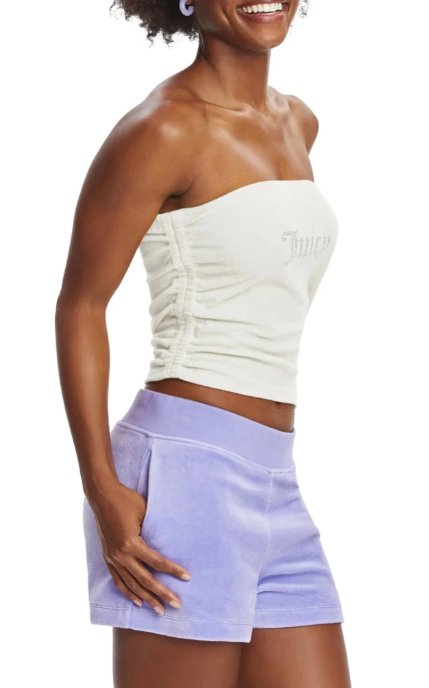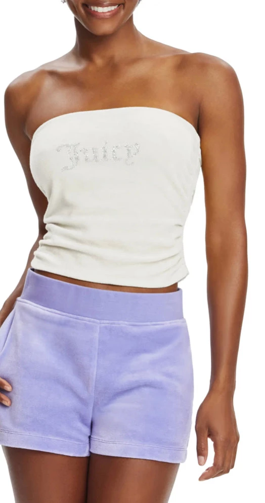 Sporty goes glam in this ruched-terry tube top featuring a rhinestone logo and cropped silhouette.