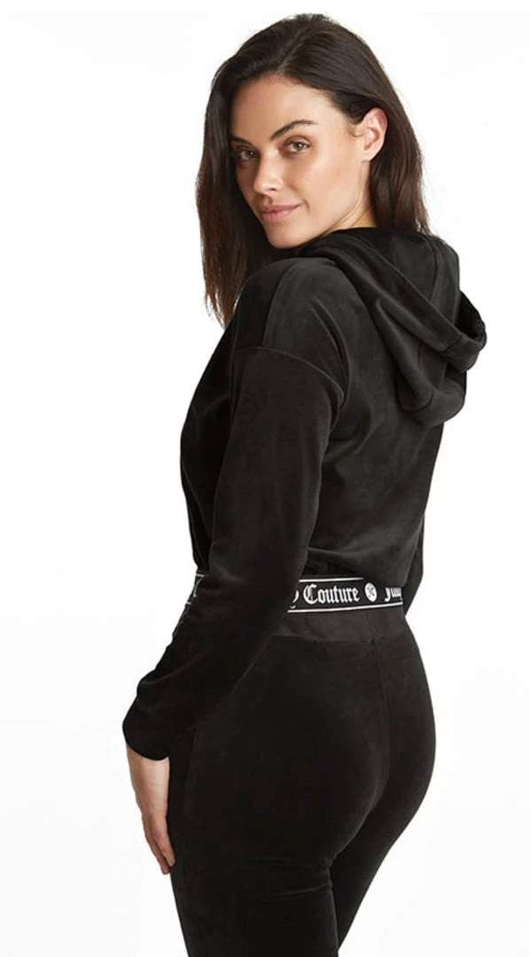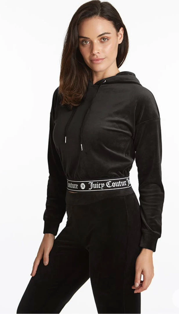 Updated for the season, we cropped our classic luxe velour hoodie and added a logo-laden black and white elastic band at both the hem and inside neck for an extra dose of ’90s nostalgia. Finishing touches include jc stamped hardware on the hood’s drawstring ties.