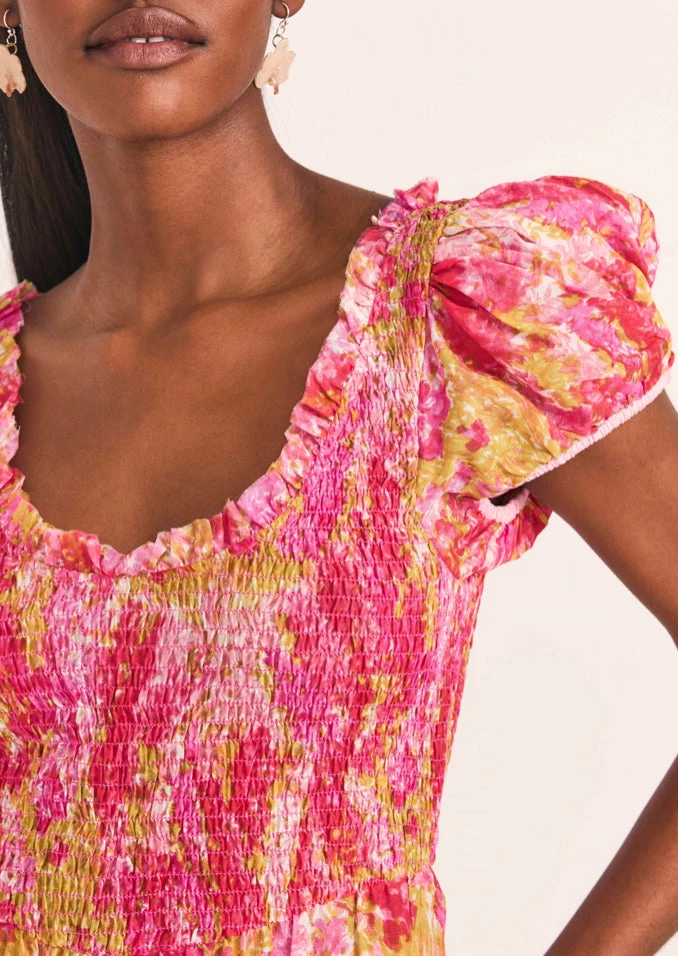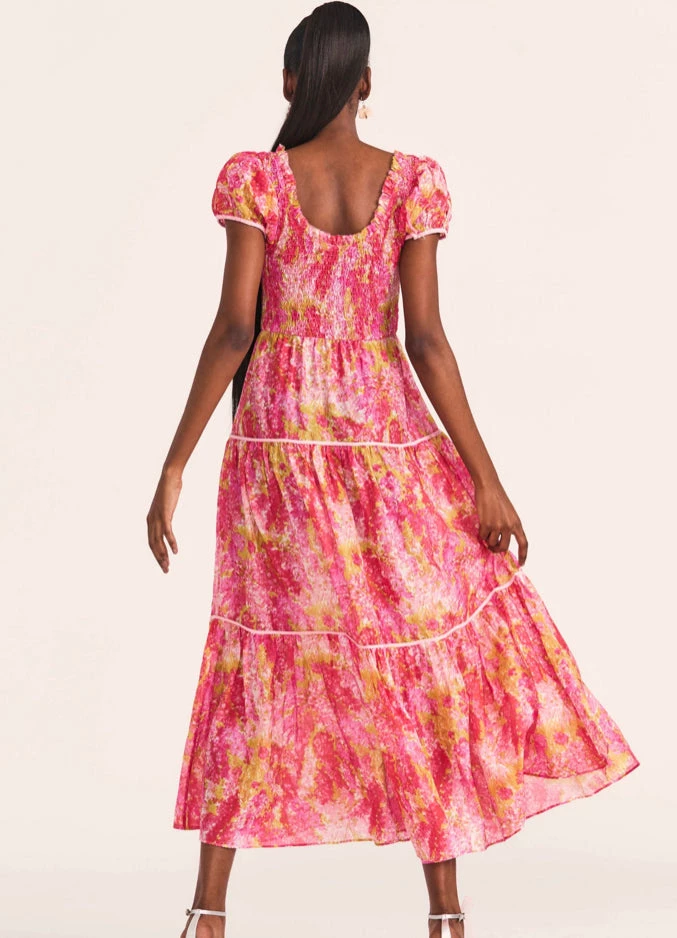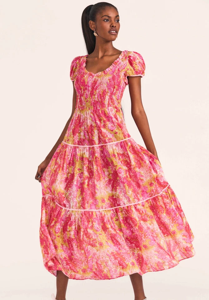 The Elisabelle Dress is an instant LoveShackFancy favorite in a cotton-silk blend with a hand-painted impressionistic watercolor print and contrast piping. This flowing frock has puffed sleeves with elastic at opening, a raw ruffle-trimmed scoop neck that can be worn on or off the shoulder and a smocked bodice. The skirt, with shirred panels, billows to a full sweep.