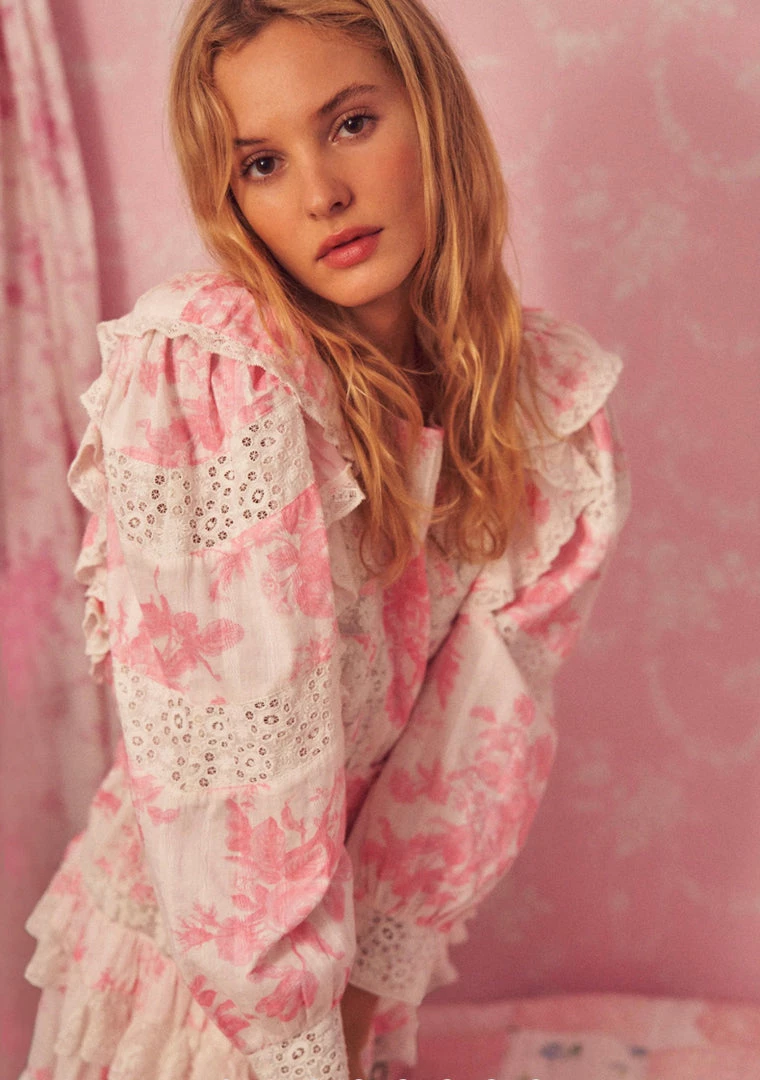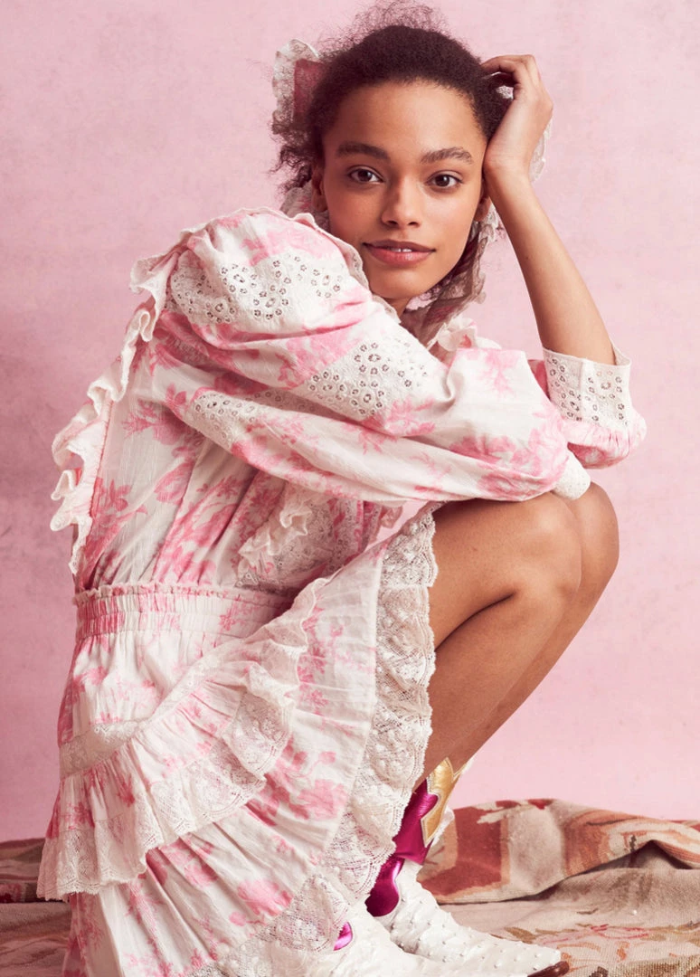 Our new Victorian-inspired Santorini Dress arrives in striped dobby cotton with pintucking, custom floral lace and this season’s tossed bouquet print. This frothy frock has a scoop neck, tapering ruffles down the princess seams and generous sleeves with relaxed openings. Below a shirred elastic waistband, the miniskirt drops to tiered flounces. Buttons at back.