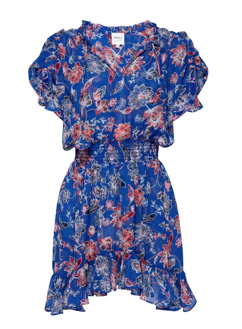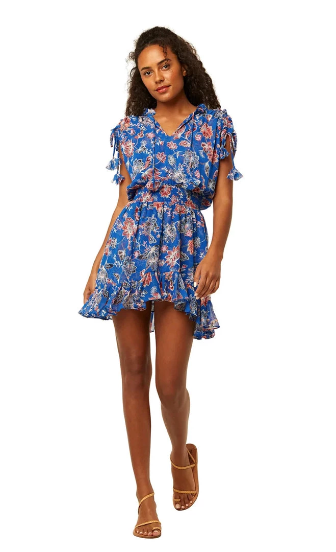 A new flirty mini silhouette handcrafted from a blue and red floral chiffon. Featuring a split neckline with adjustable petal ties complemented by matching adjustable petal ties at the sleeve. A comfortable smocked elastic waist drapes into a double-lined asymmetrical ruffled skirt.