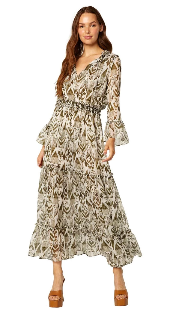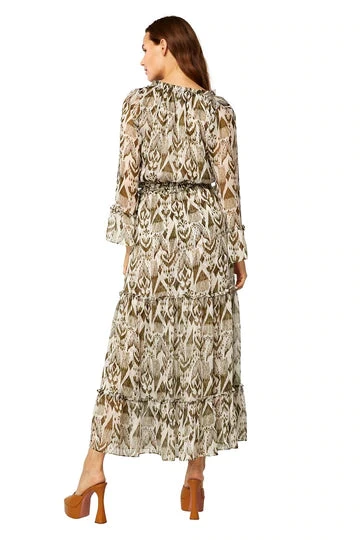 Misa has brought back one of our best-selling silhouettes for spring. Cut from a gorgeous olive green ikat print chiffon, the Lucinda dress exudes effortless feminine chic. Featuring flowing ruffle trimmed long sleeves and ruffle cuffs. A split neckline with our signature petal ties. An elasticated waist leads into a flowing maxi length skirt with a wide ruffle hem.