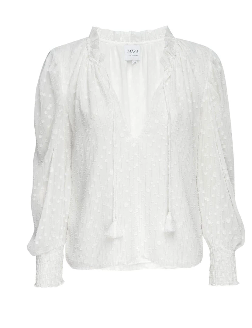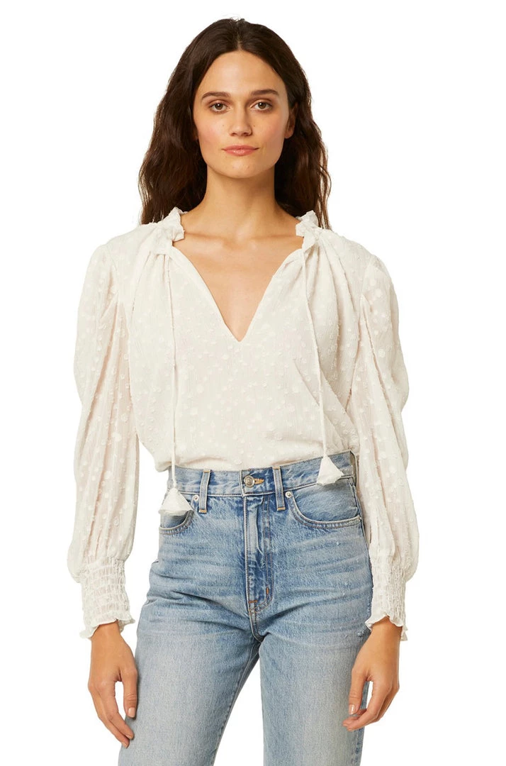The Siena exudes a chic bohemian vibe. Handcrafted from a whimsical clip dot chiffon with lurex, this effortless blouse features smocked cuffs, a split neckline with contrast ruffle trim and finished with our signature petal tassel ties. Complete the look with the coordinating Marion mini or Carmen midi skirt.