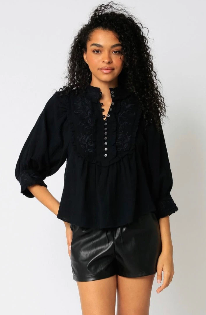 This Olivaceous Gauze Crochet Peasant Blouse features a mandarin collar and button up front.