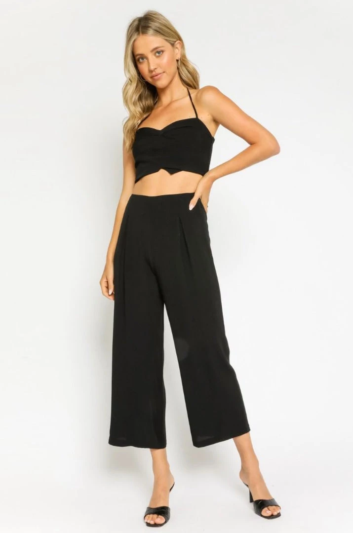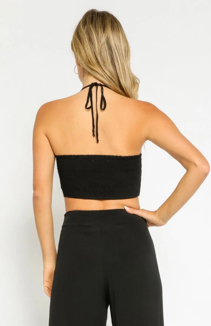 This Olivaceous Cropped Halter Tank features a sweetheart bust and ruched body.