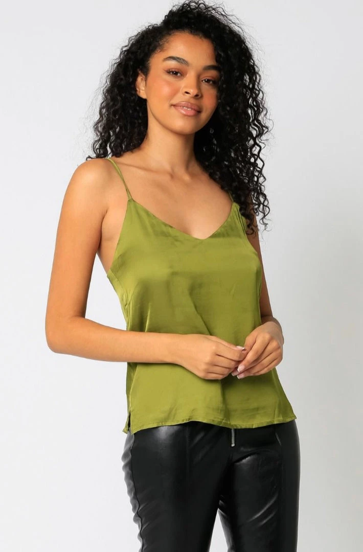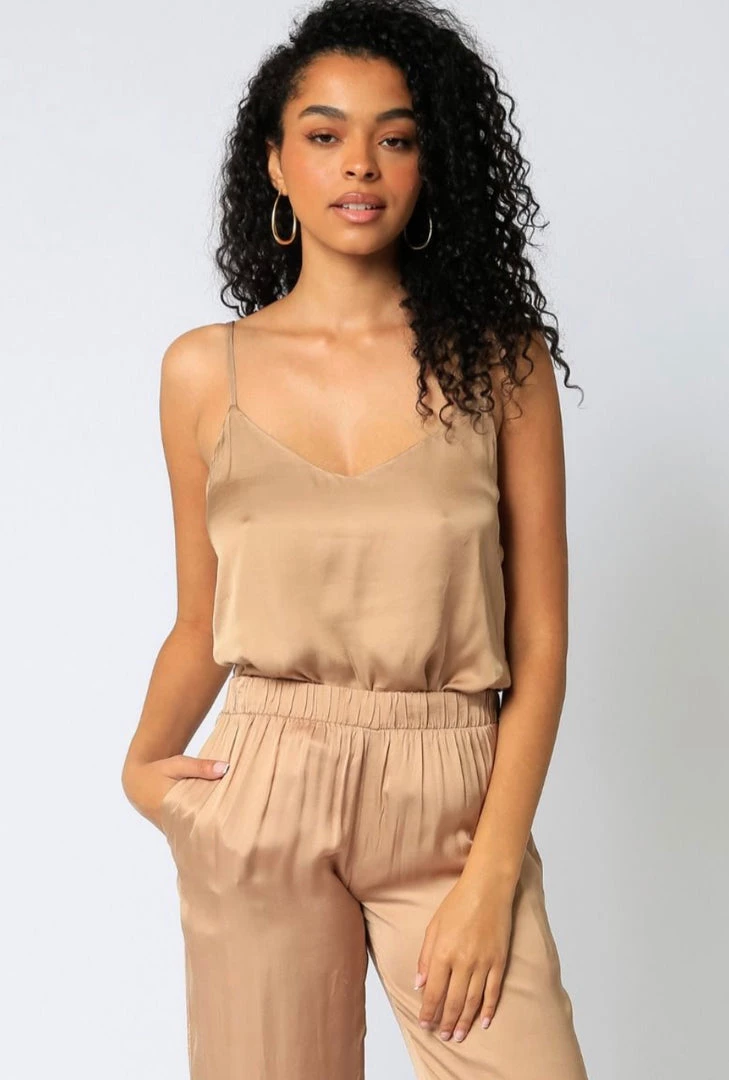 Our Satin V Neck Tank features adjustable straps and a relaxed fit.