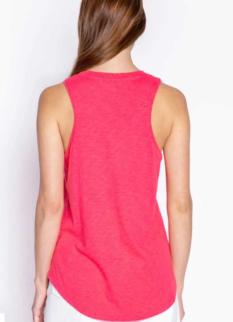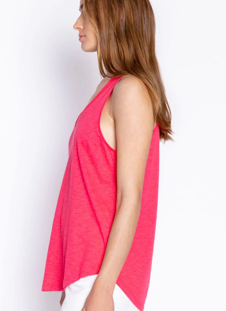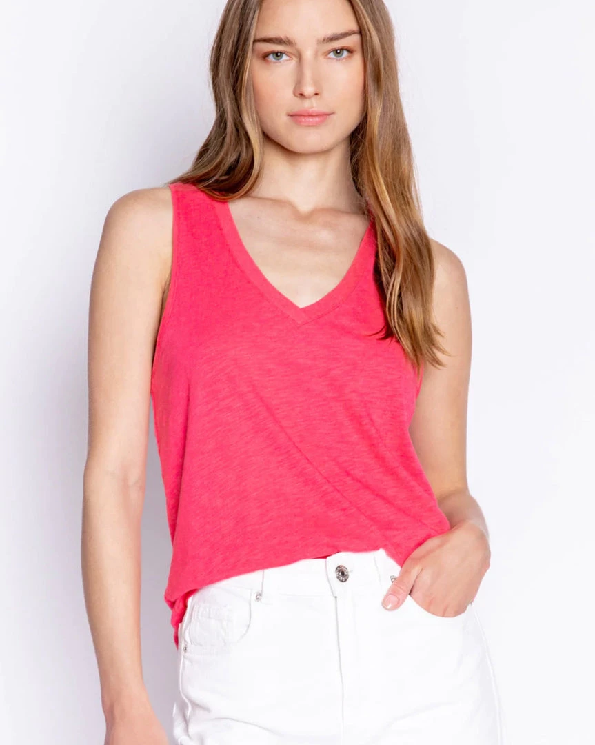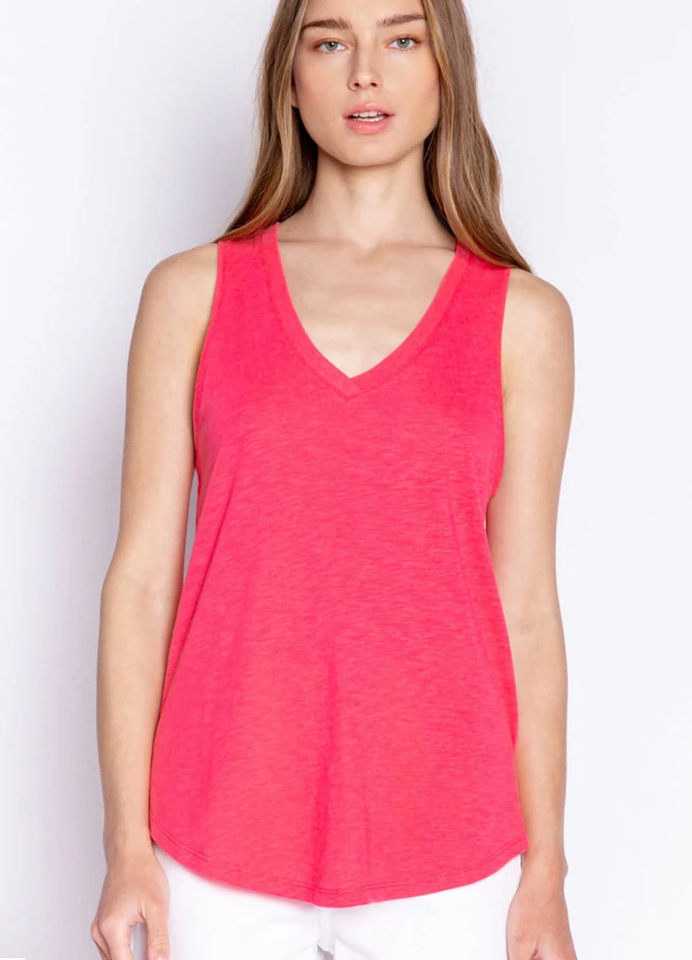 Get your fix of beautiful coral in this V-neck tank top, in cotton-blend slub jersey. We love the rib trim and flattering back seam details. Tank has a longer length, with rounded hem.