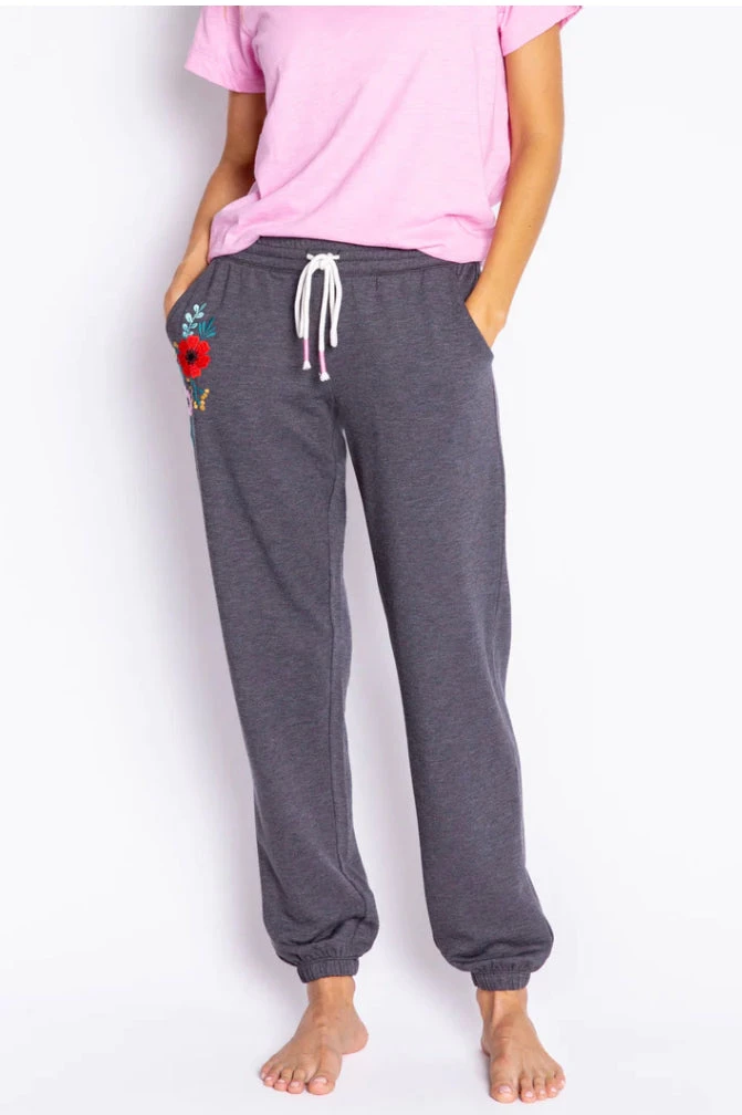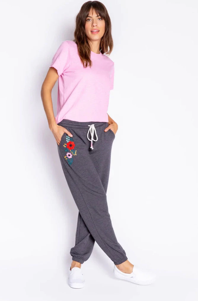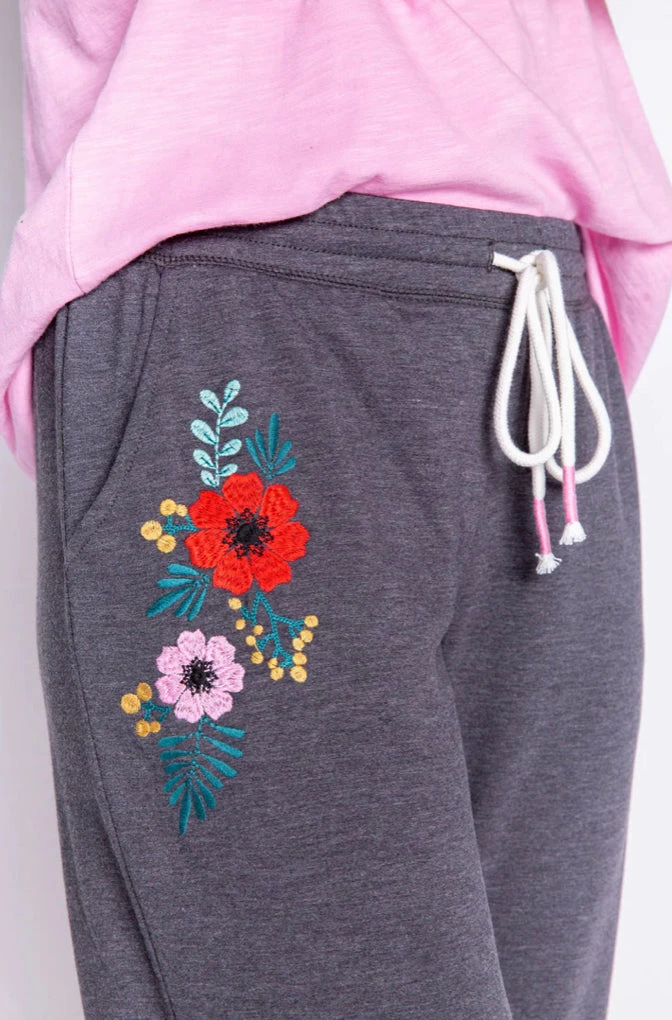 A wearable heather terry jogger steps up with a floral treatment. Side of pant leg is detailed with multi-floral embroidery and makes a great way to brighten any outfit.