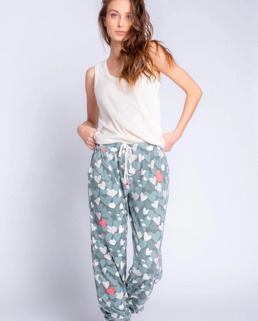 A banded pant full of love. You’ll be hard-pressed to find a softer jogger with comfy pockets and tie waist. This season’s cutest camo-heart print!