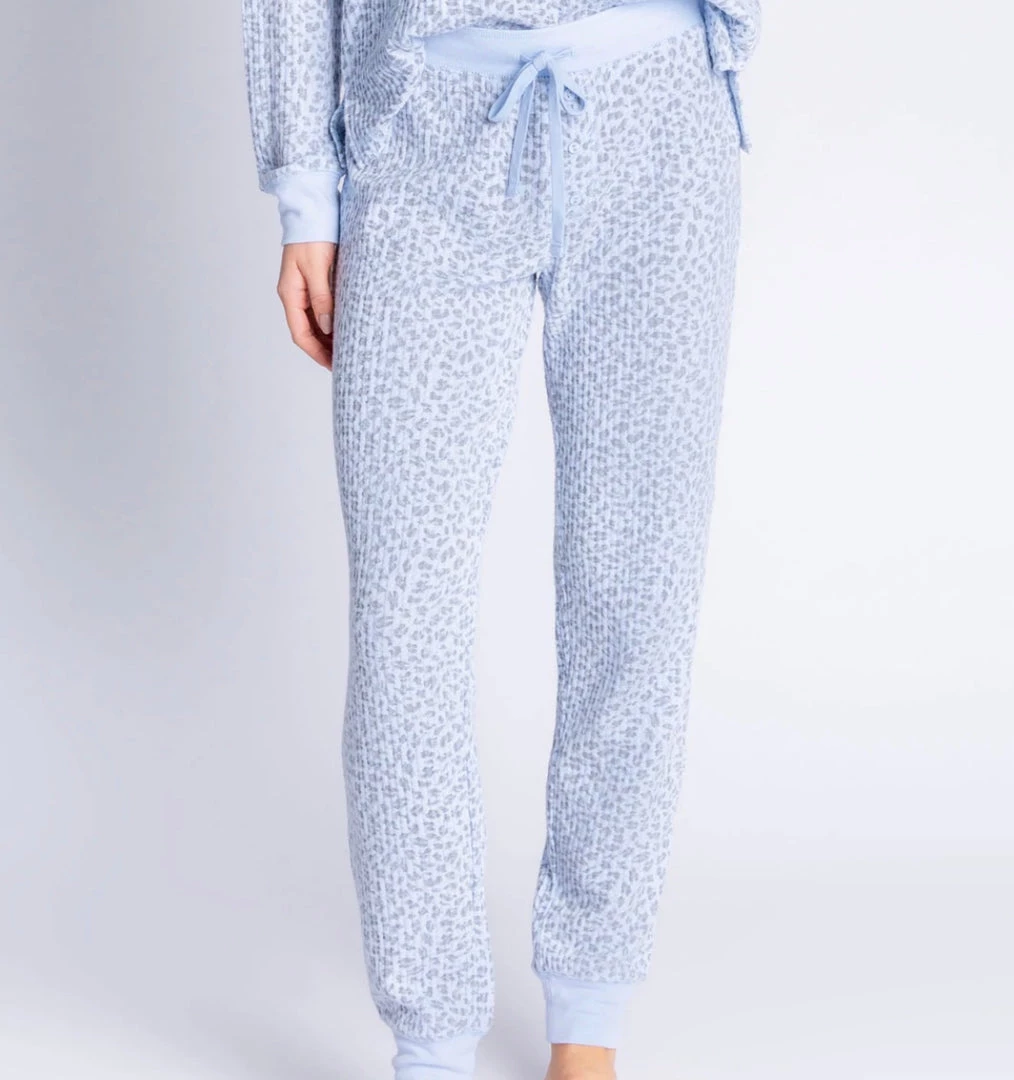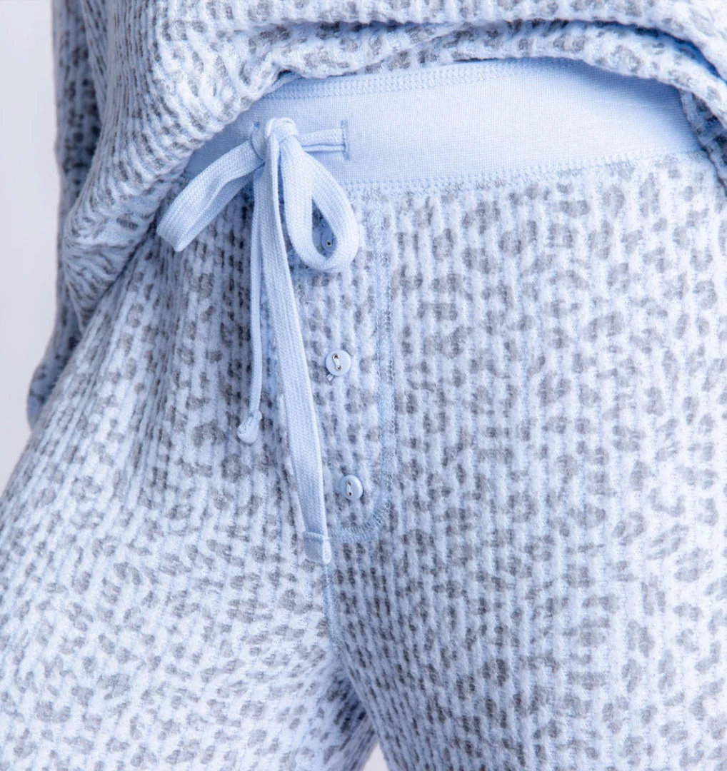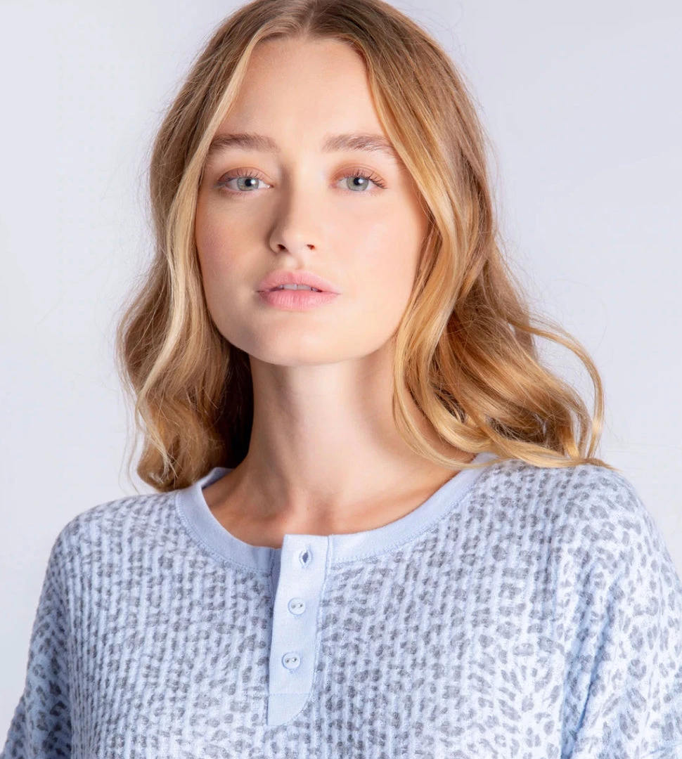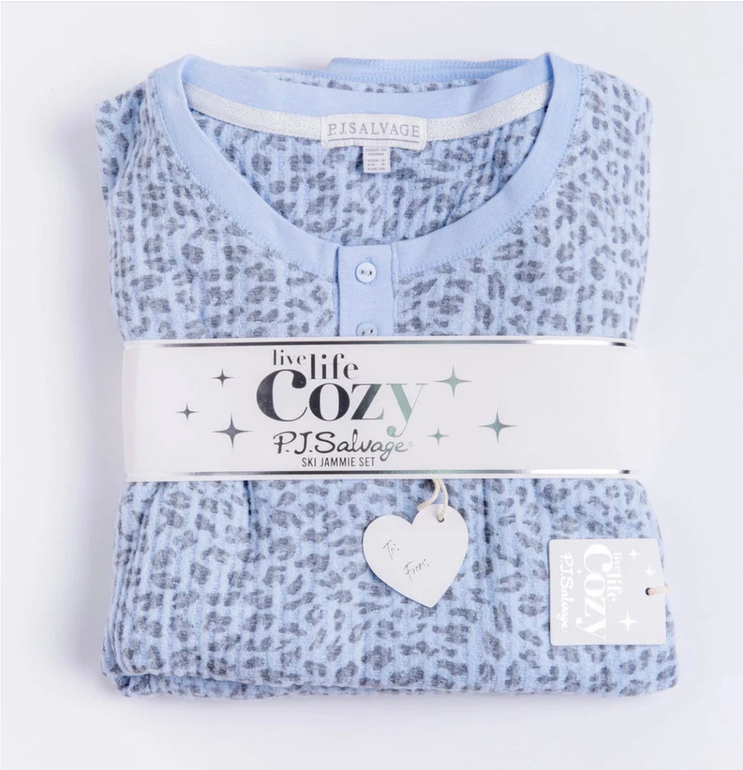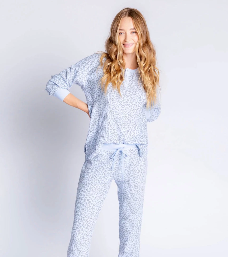 DESCRIPTION: Cuddle up in a trending animal-print jammie set. Our favorite time of year because we LOVE thermal pajamas – in a must-have blue leopard print with button-up neck and banded pj pant. Care tip: we wash ours inside out to minimize pilling.