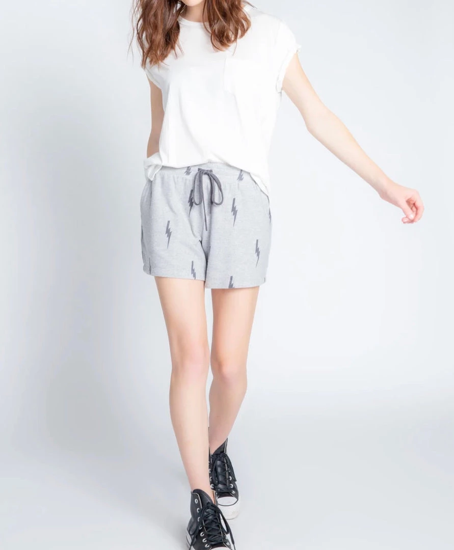 DESCRIPTION: Plug in, recharge in this comfy length short with a 5″ inseam. Super soft heather grey peachy with mini lightning bolt print. Relaxed fit with side pockets.