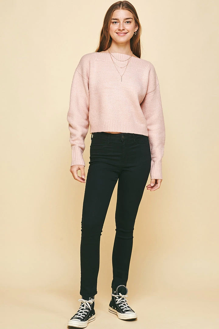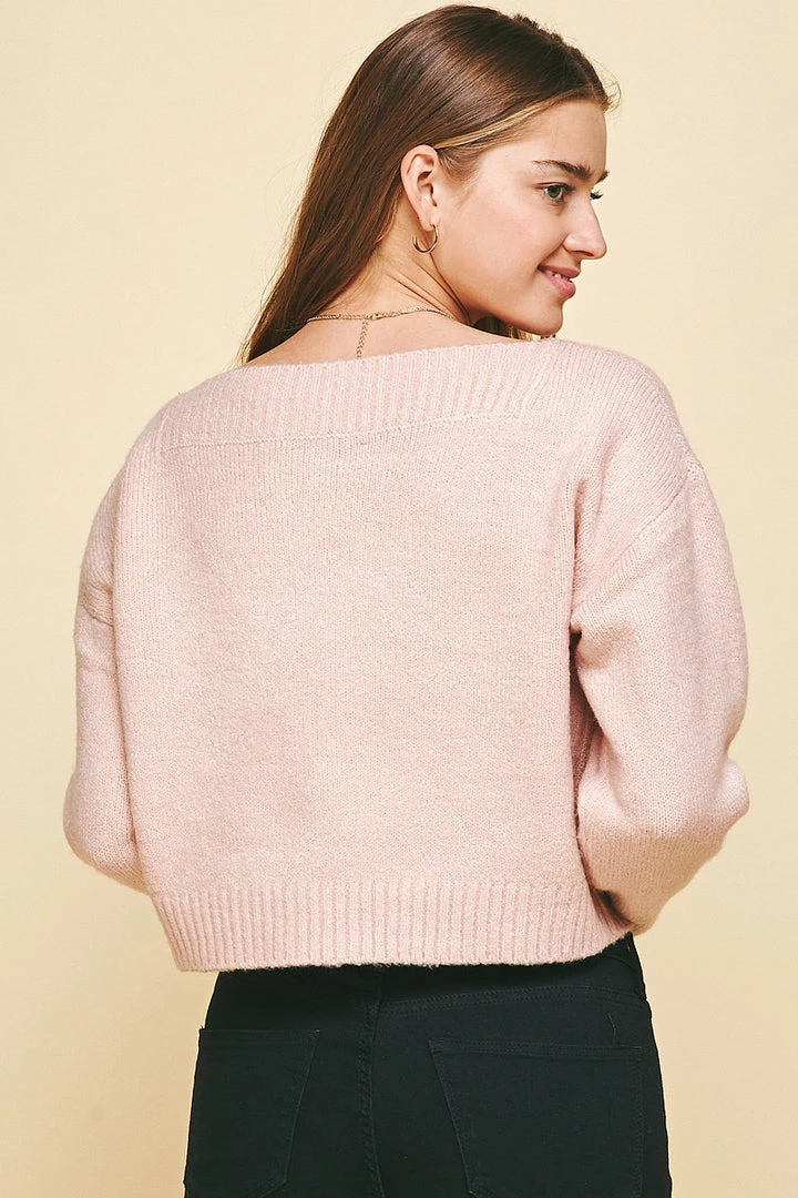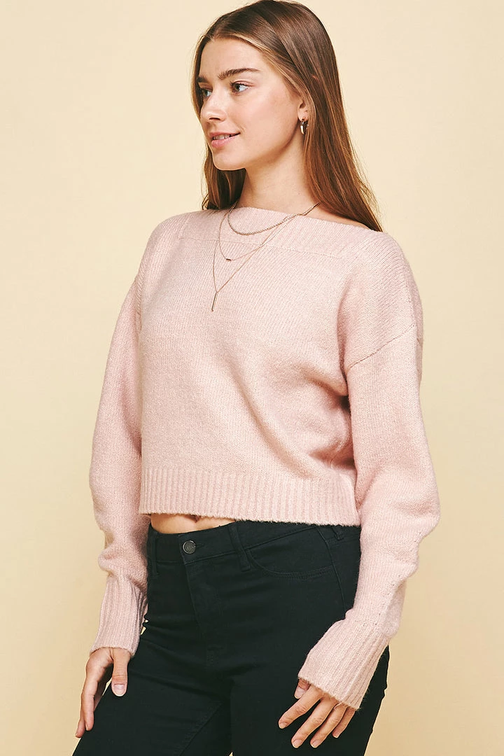 This Pinch sweater has a slight boatneck opening and ribbed edges.