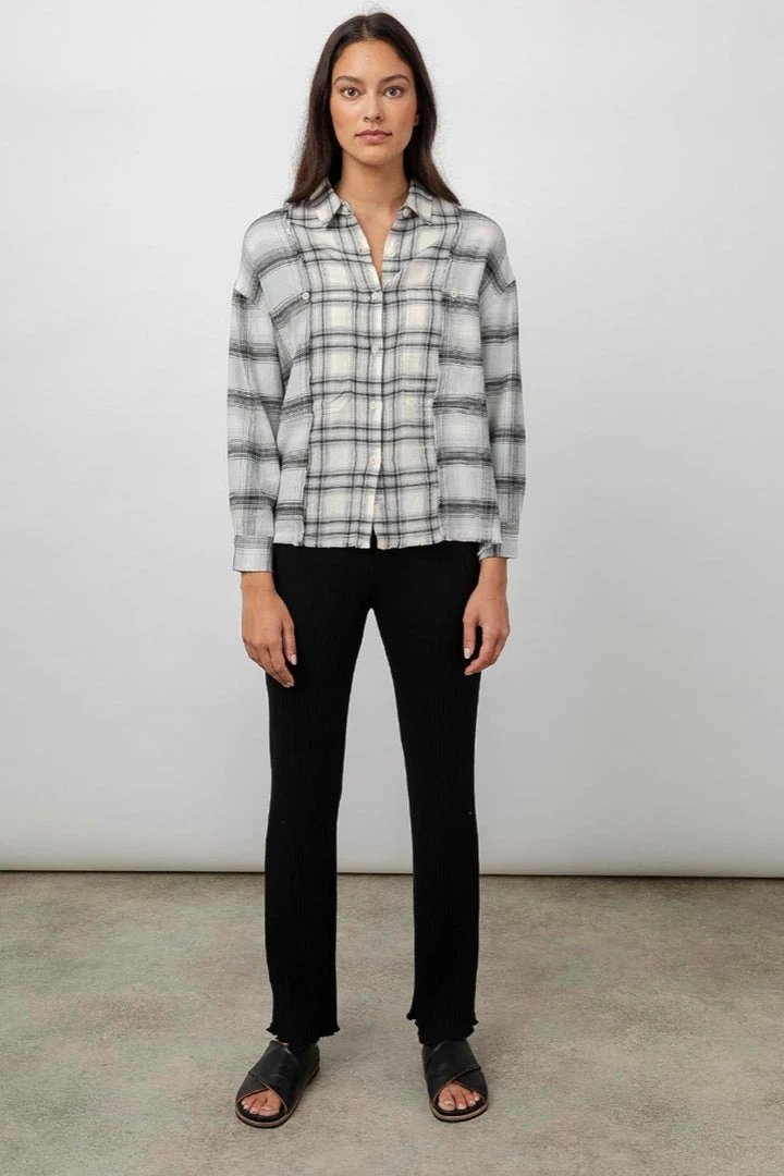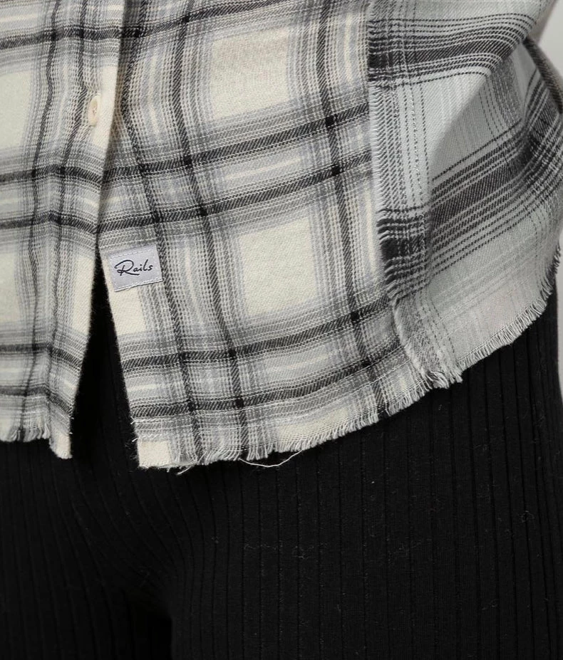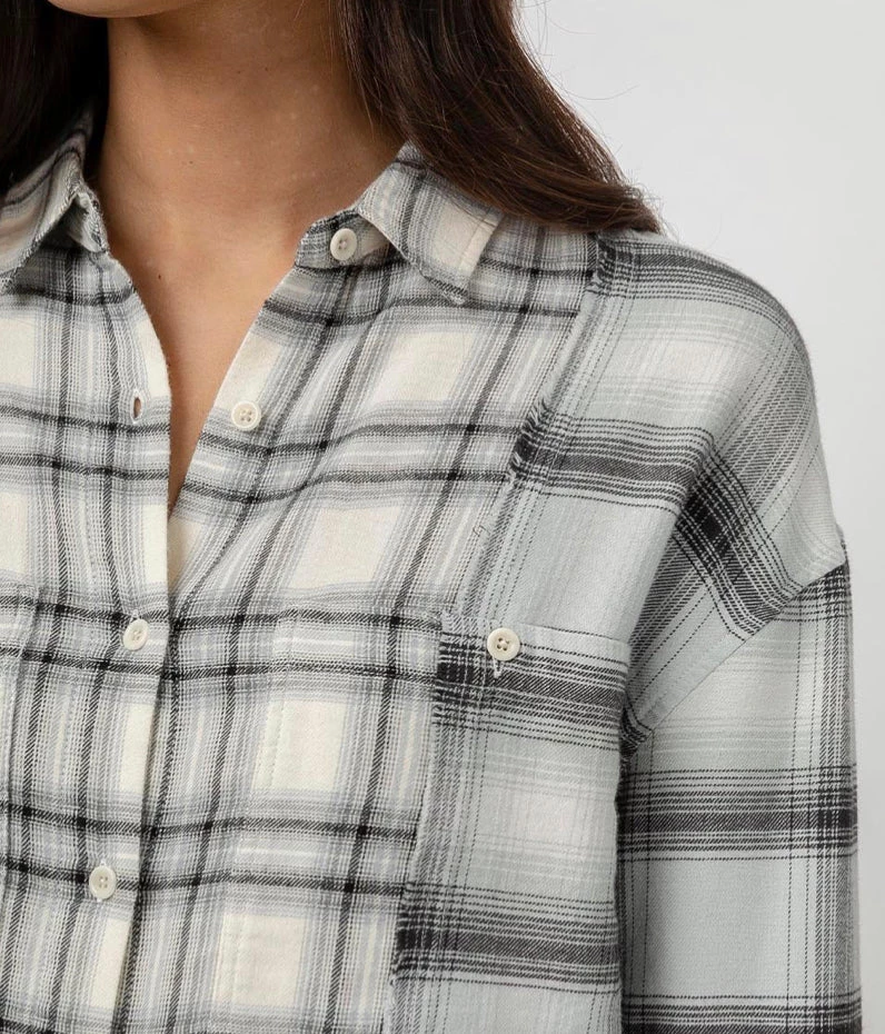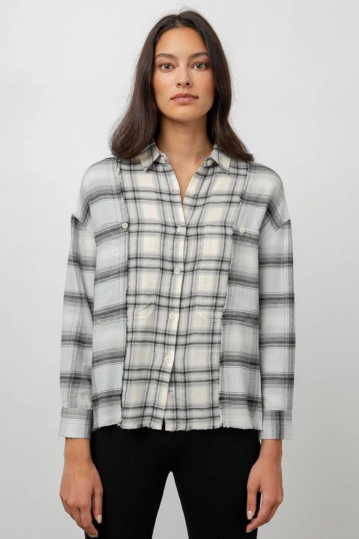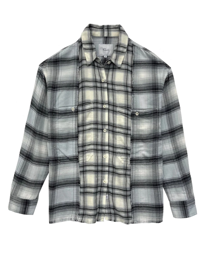 Lightweight, vintage flannel, long sleeve, ivory and frost mint collared button-down shirt featuring charcoal grey and black plaid design, fringe and frayed detailing, relaxed fit, raw hem, and patch pockets at chest. An edgy patchwork take on the classic plaid shirt.