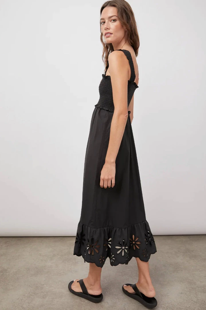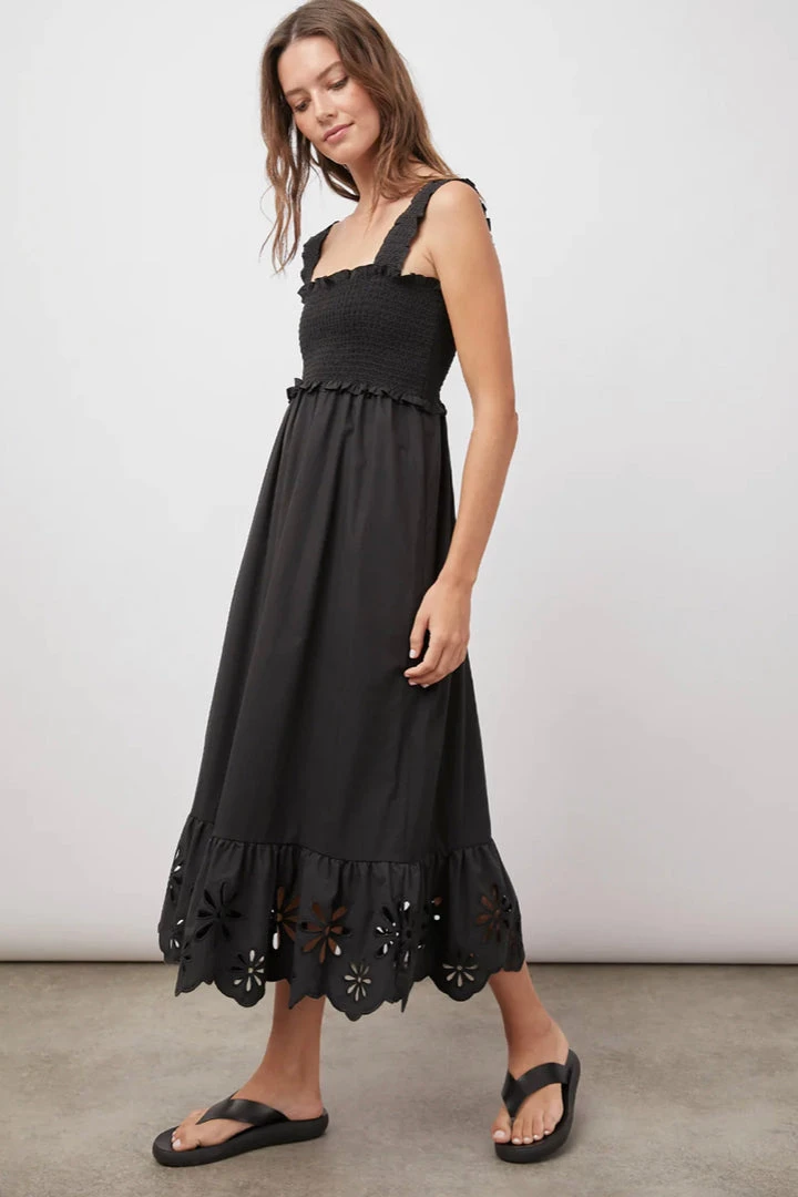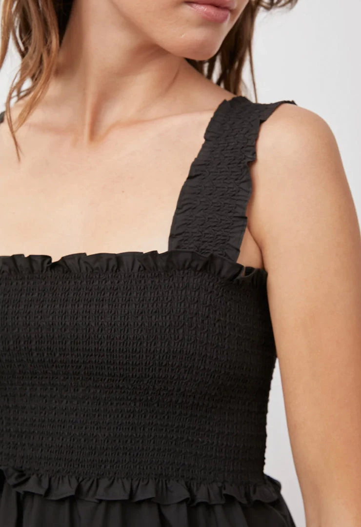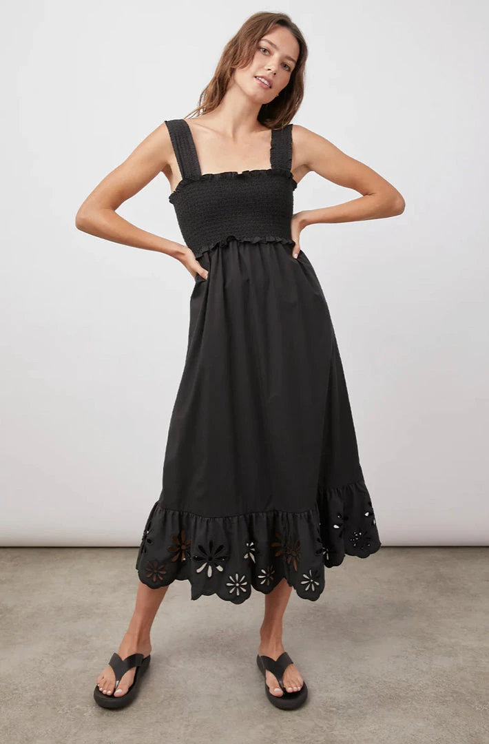 This timeless midi length dress wit its feminine ruffle details is perfect for transitioning into summer. Made from lightweight cotton poplin, this midi dress features a square neckline, swingy fit, smocked bodice, and wide shoulder straps.