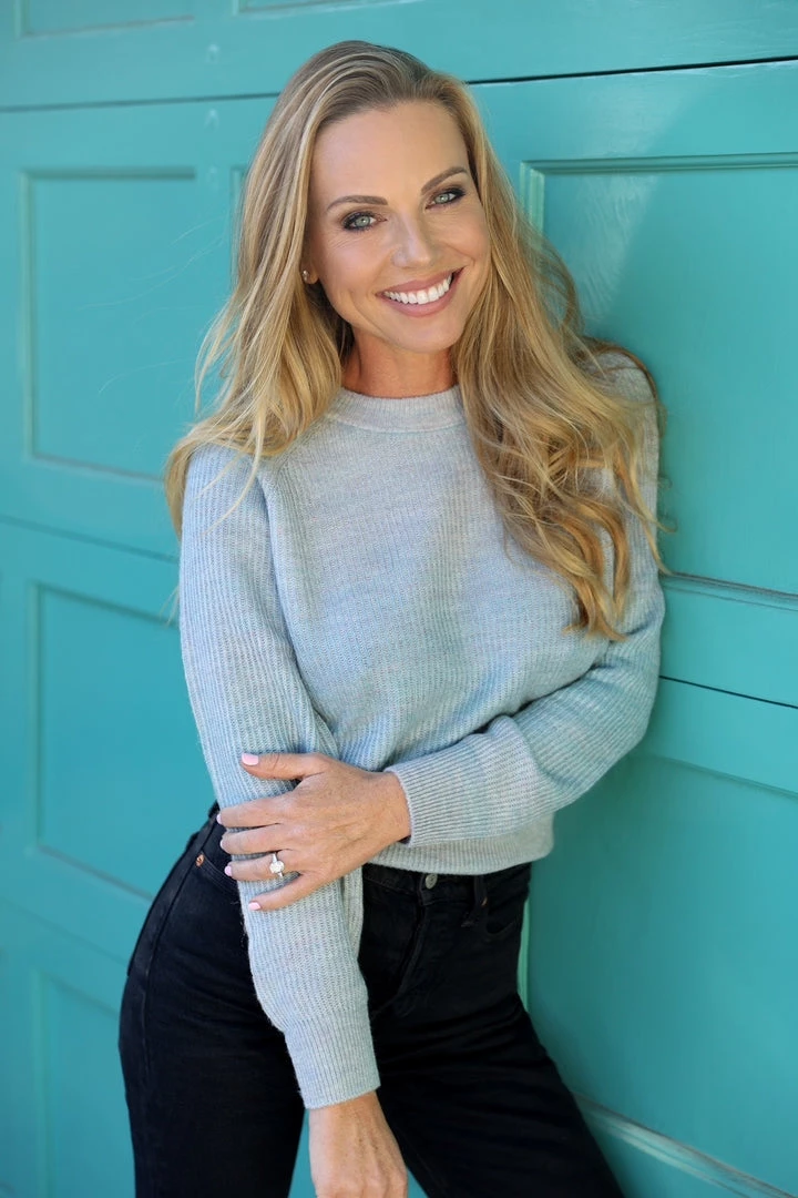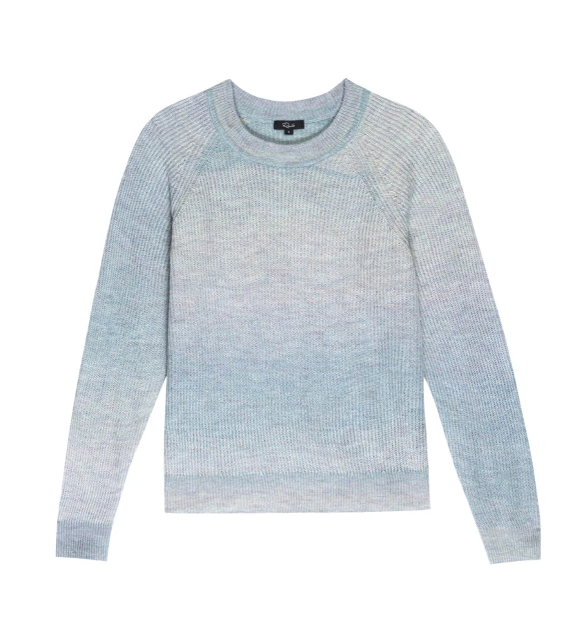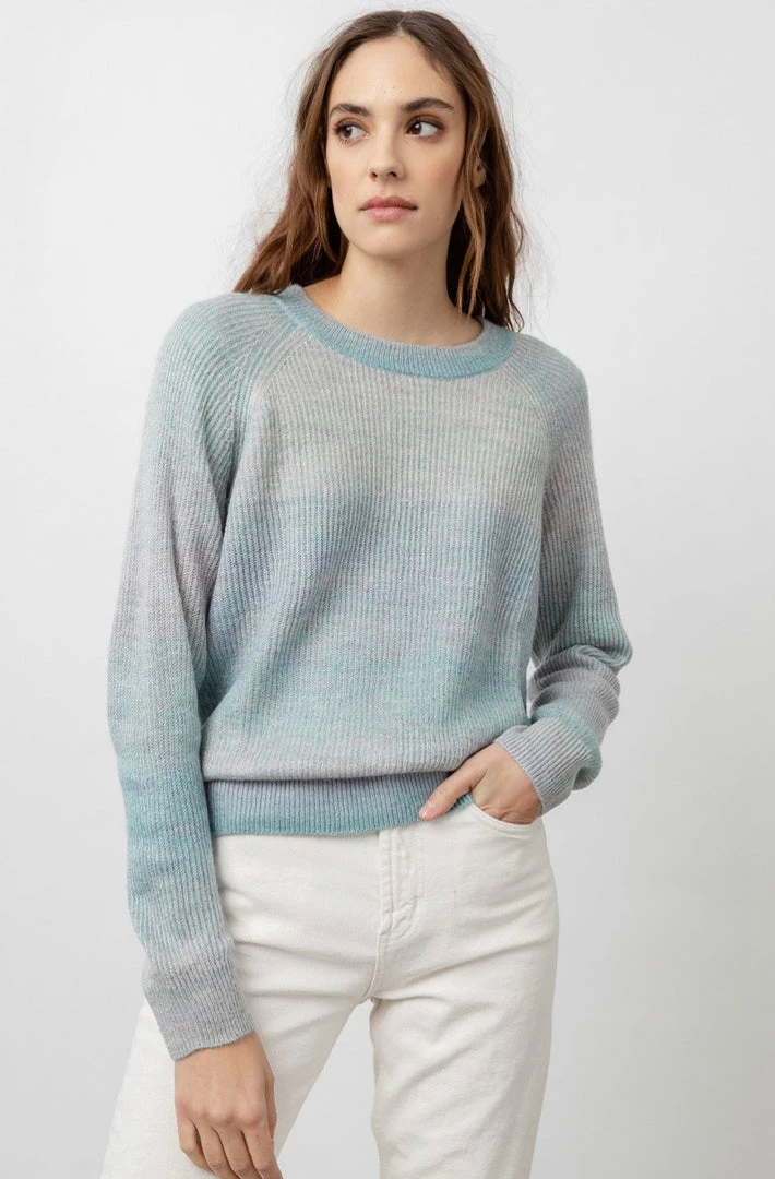 Lightweight, nylon blend, long sleeve, aqua blue crew neck sweater featuring cool toned rainbow gradient color throughout, relaxed fit, and rib stitch at raglan sleeve. This lightweight, uniquely dyed sweater is the perfect transitional piece to effortlessly take you from season to season in style.