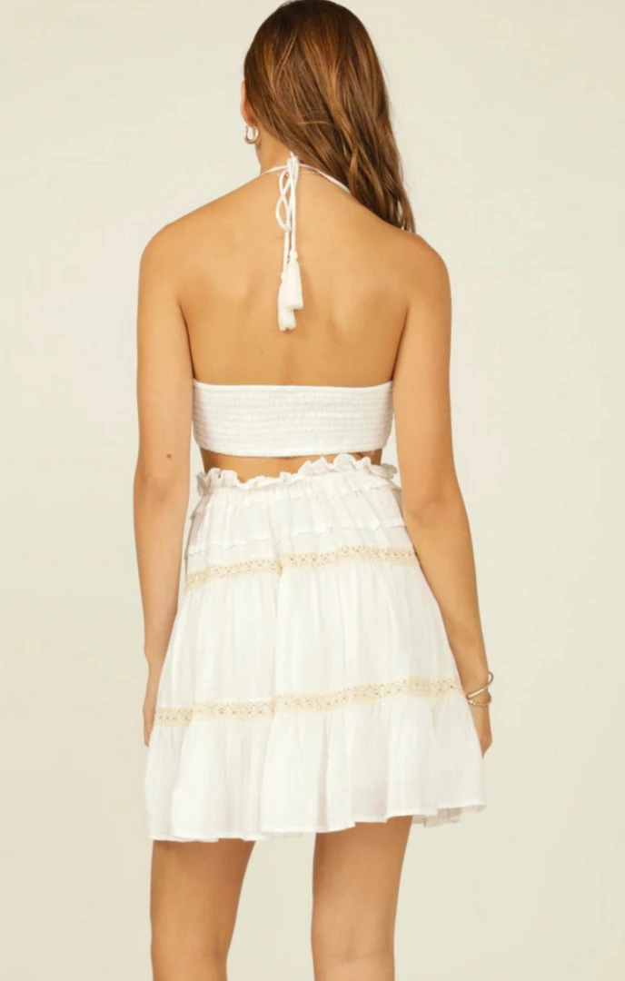 The White/Natural Contrast Crochet Knit Cutout Ruffle Dress features: