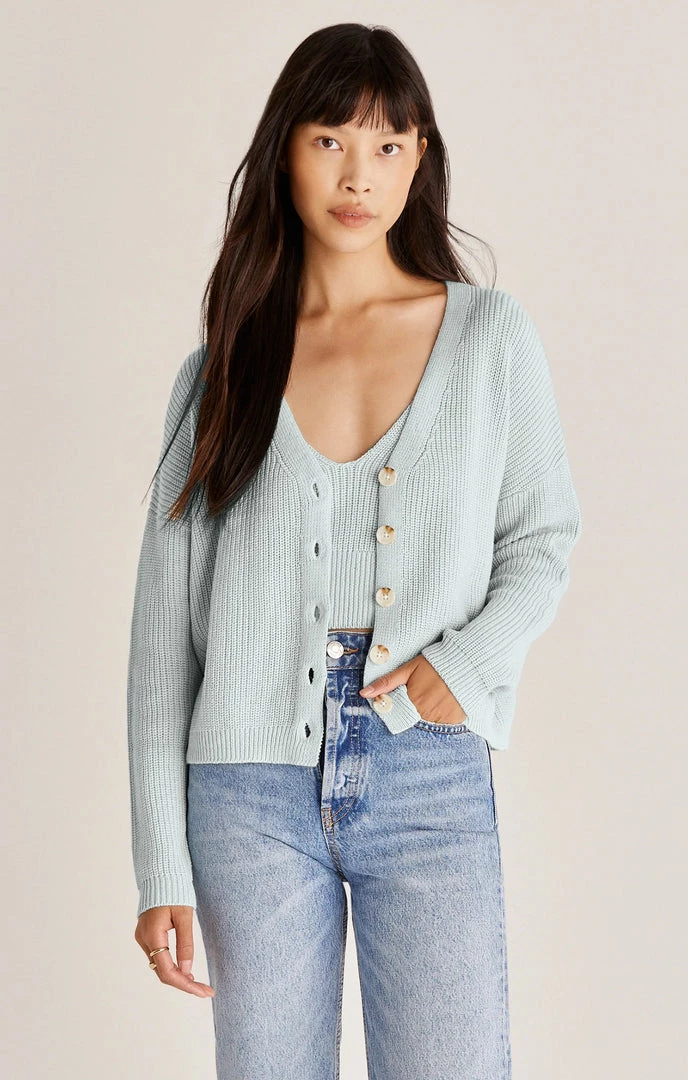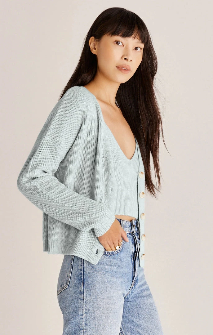 Two pieces are better than one! Part of our two-piece set, the v-neck Morgan Cardigan is cropped and relaxed with ribbed details. This button-up layer adds warmth and style to our Summer Sweater Cami.