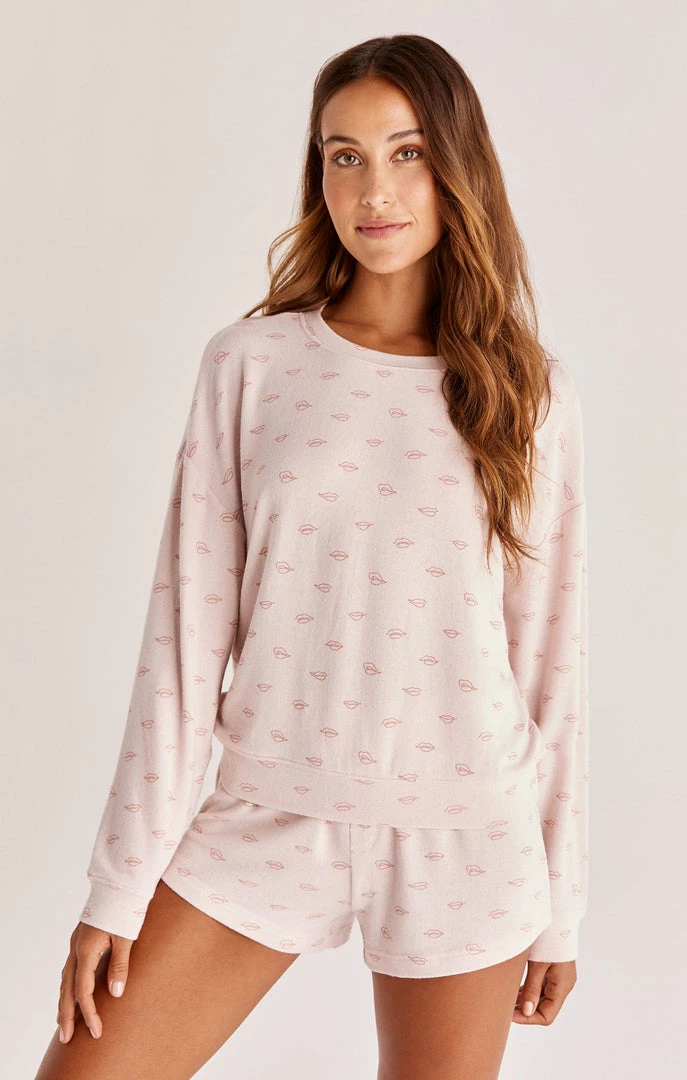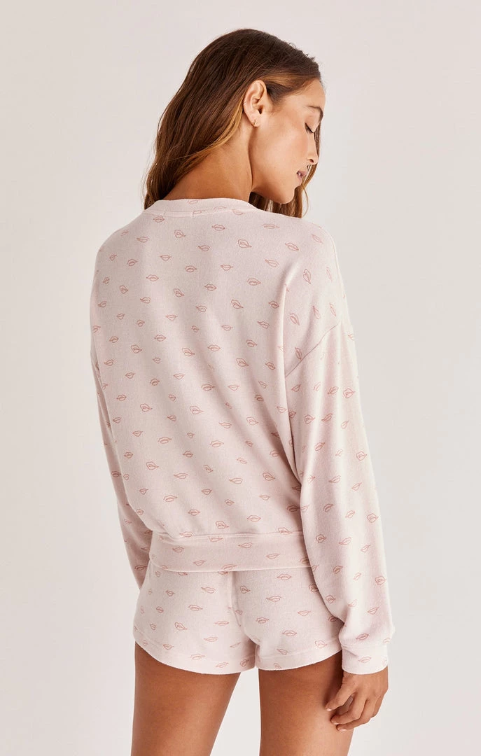 Sealed with a kiss! The Stella Kissed Long Sleeve Top, made from our Brushed Sweater Knit fabric, feels as good as it looks. Featuring a crew neck sweatshirt design covered in an allover lip print, this top is a standout novelty style she’ll fall in love with. It makes a matching set with the Briee Kissed Short.