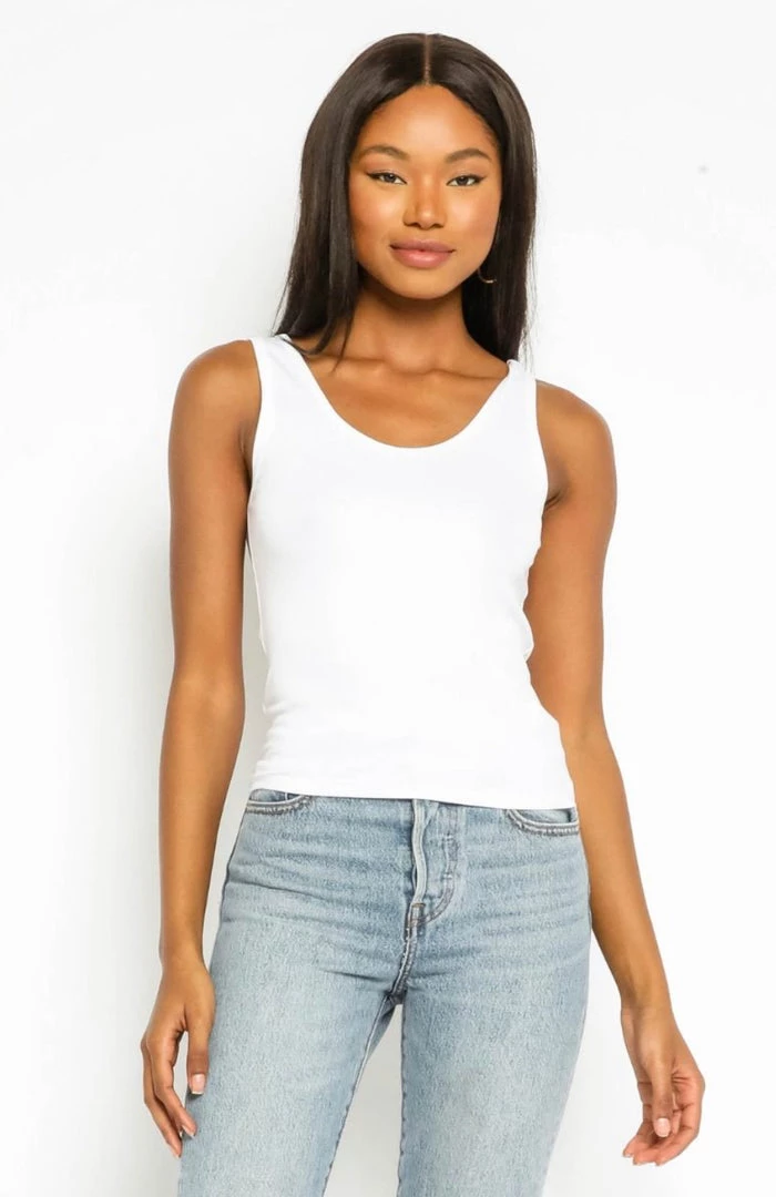 The Olivaceous Scoop Neck Tank features a fitted body and scoop back.