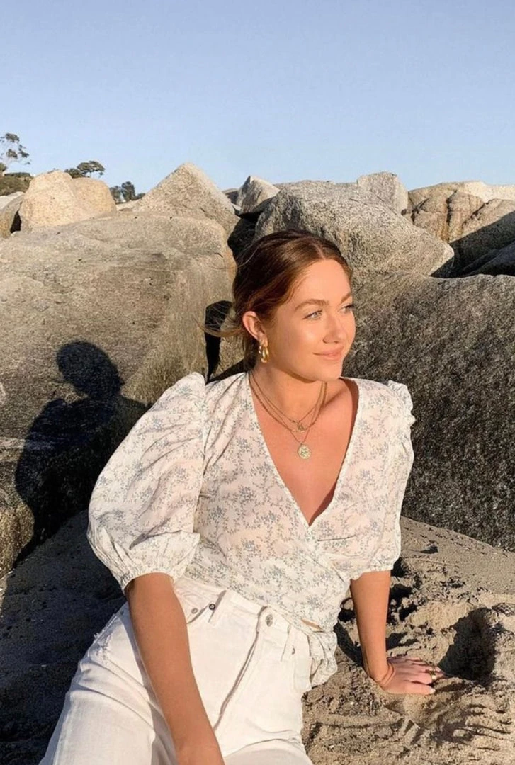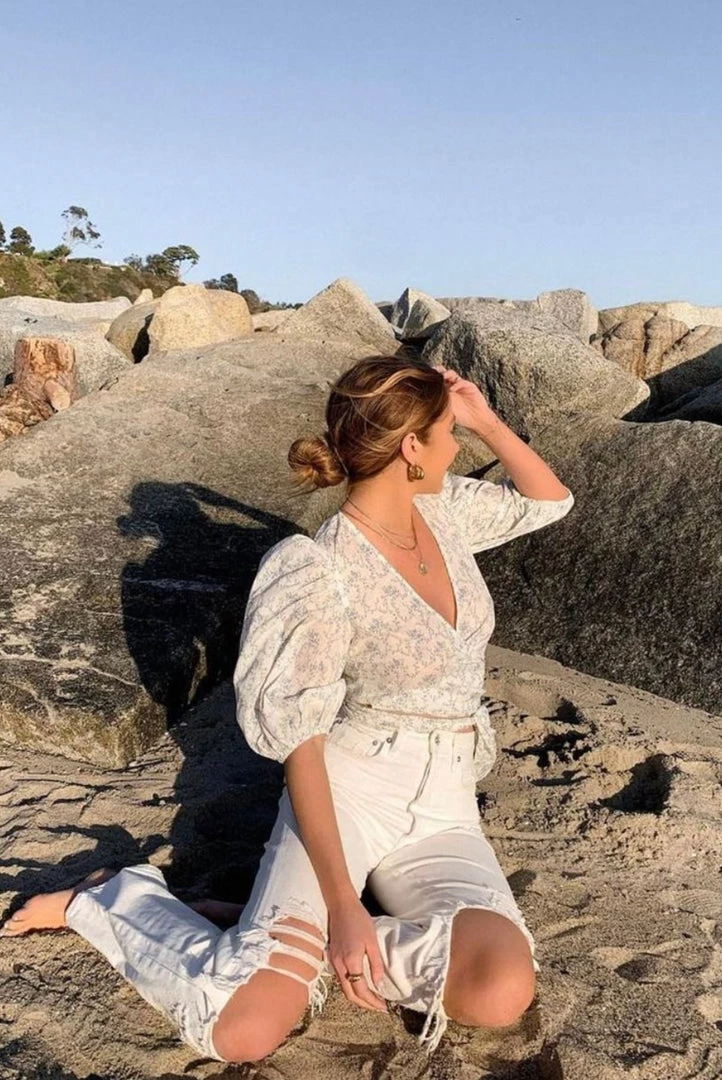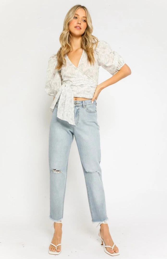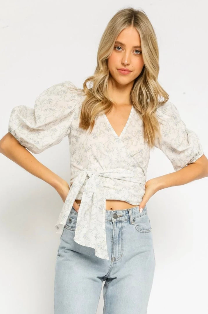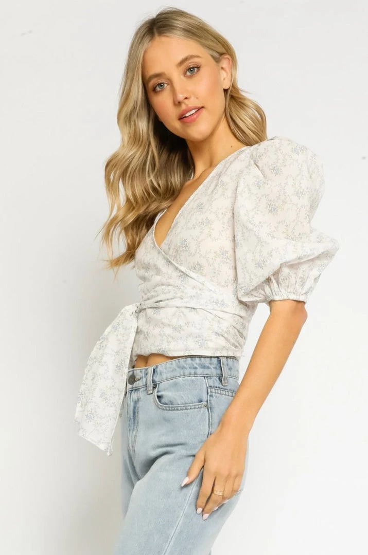 Our Blue Baby’s Breath Wrap Top features puff sleeves and a cropped hem.