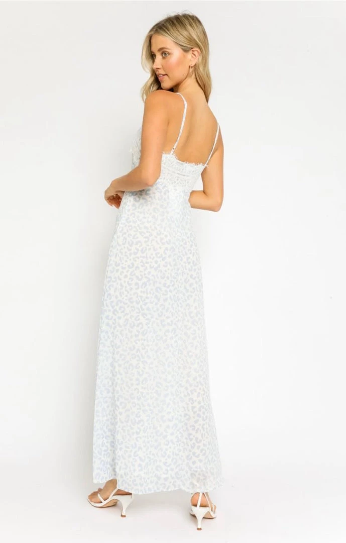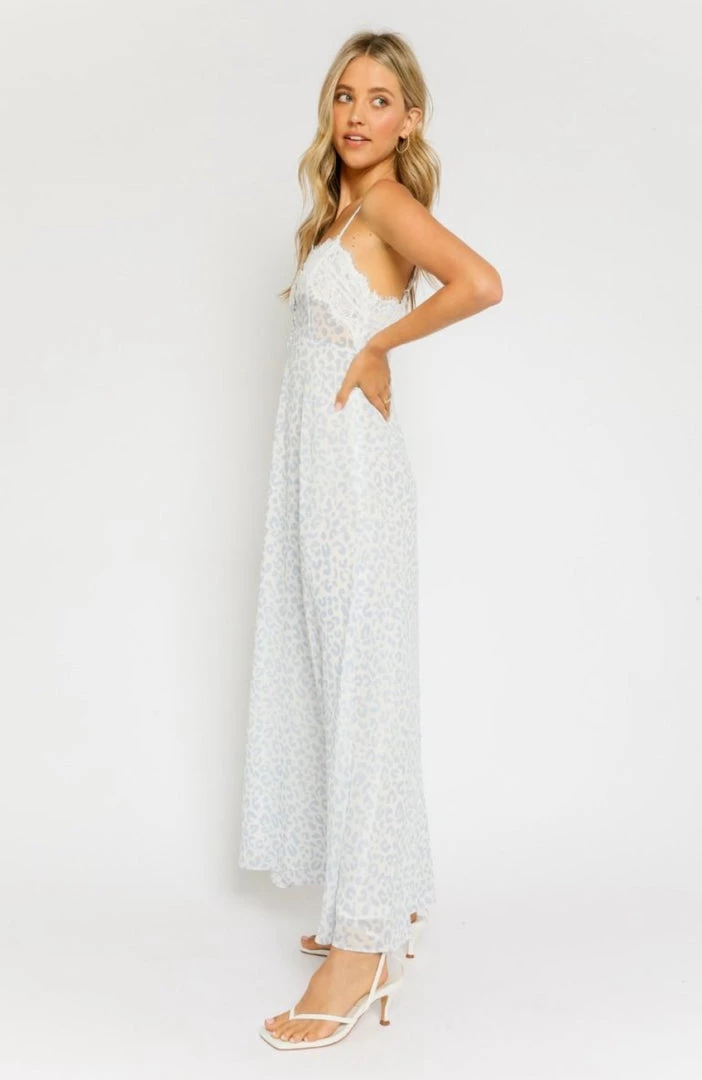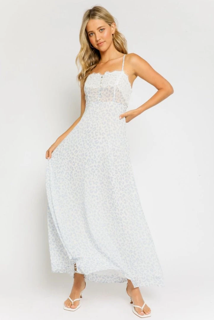 This Olivaceous Light Blue Leopard Maxi Dress features a lace necklien and adjustable straps.