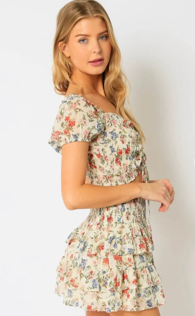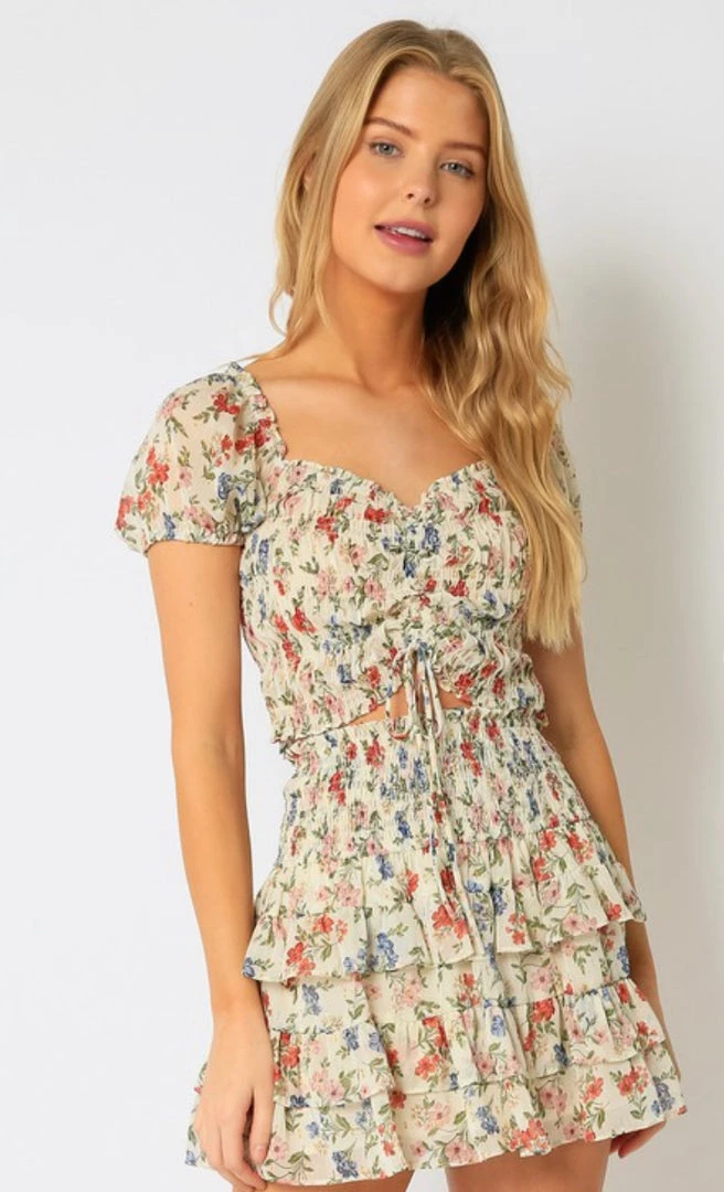Our Chiffon Dahlia Top features a cute puff sleeve with a pull front tie. Woven.