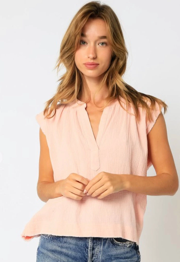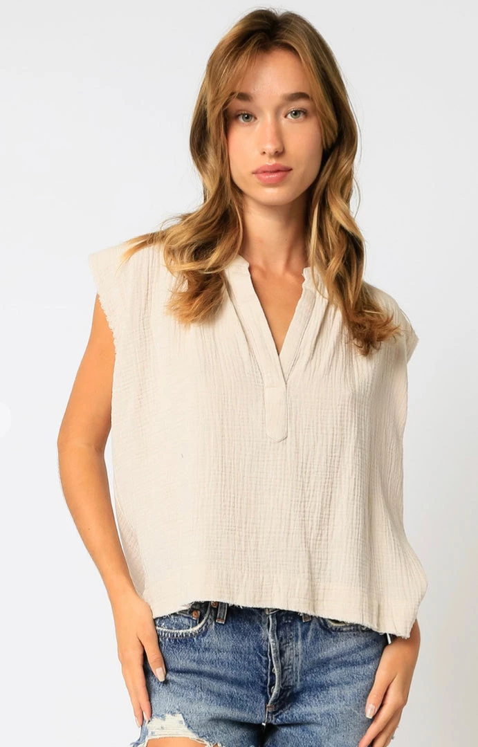 Our Cotton Muscle Tank features raw cut sleeves and a mandarin collar. Woven. Model's Measurements: Height 5'9 | Bust 32 | Waist 24 | Hips 34 | Size S
