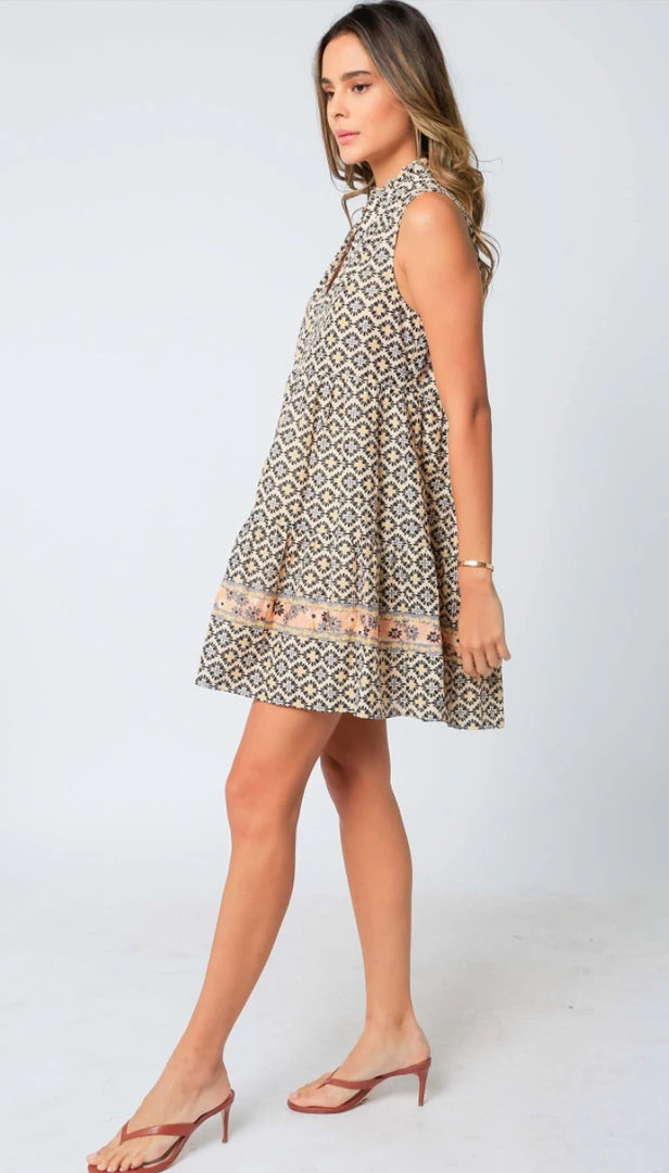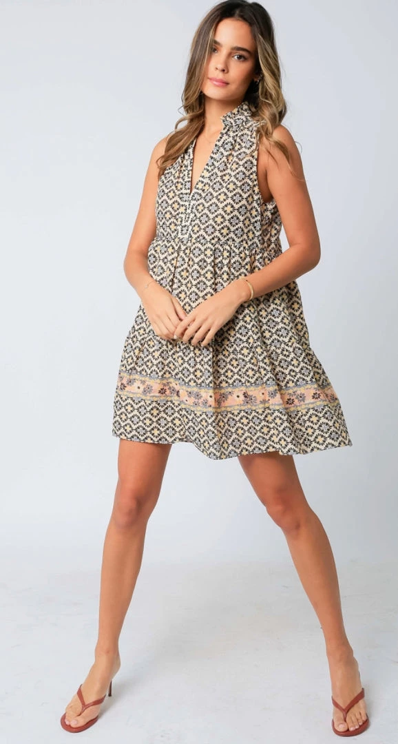 Our High Collared Mini Dress features a sleeveless design with a v-neck. Woven.
