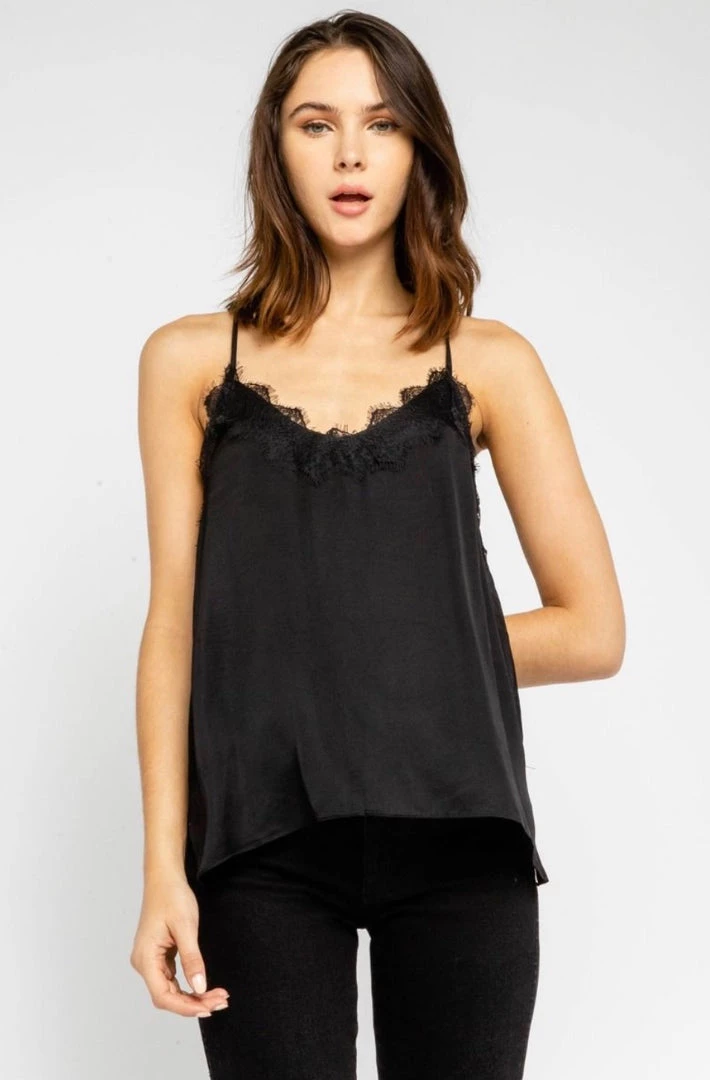 Satin Lace Tank Top features a v neck and spaghetti straps.
