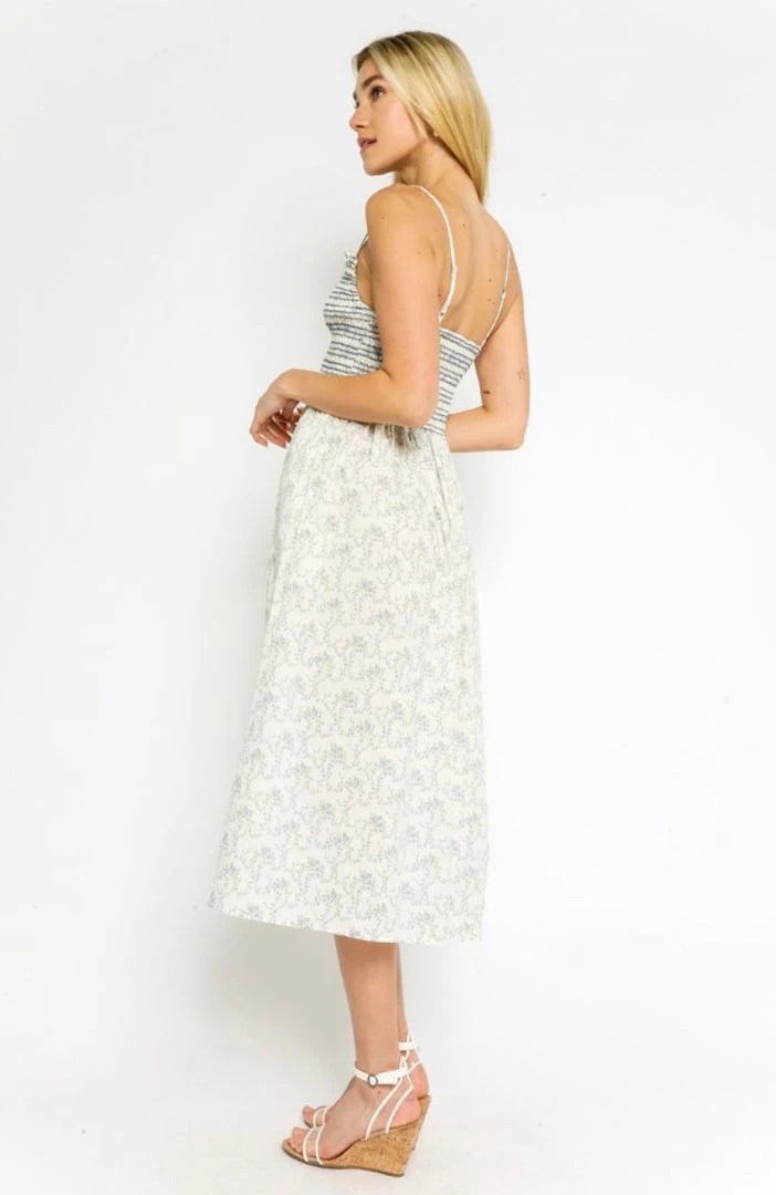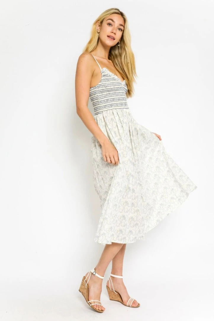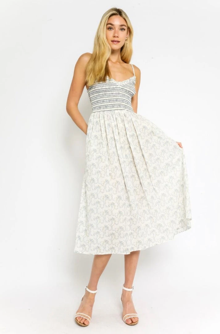 Our Olivaceous Blue Floral Midi Dress features a smocked bust and pockets.