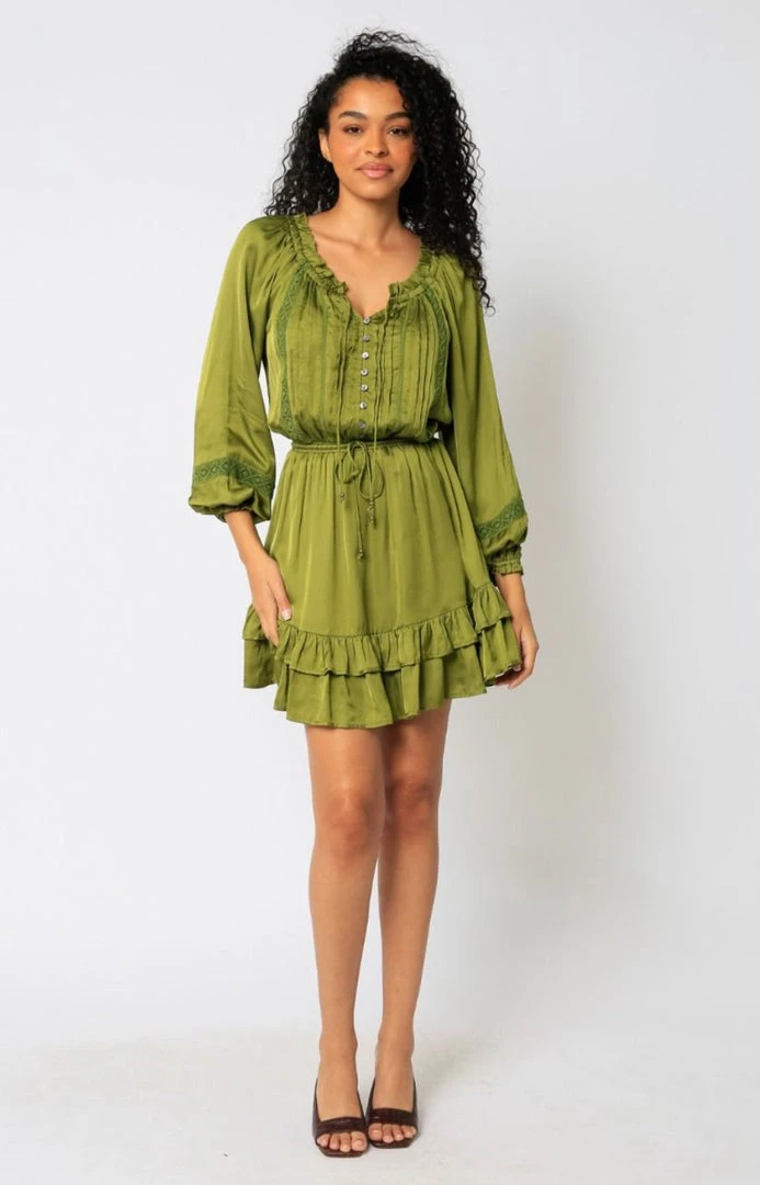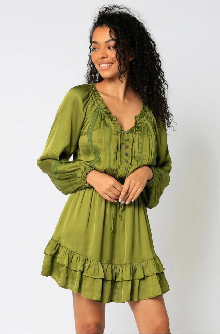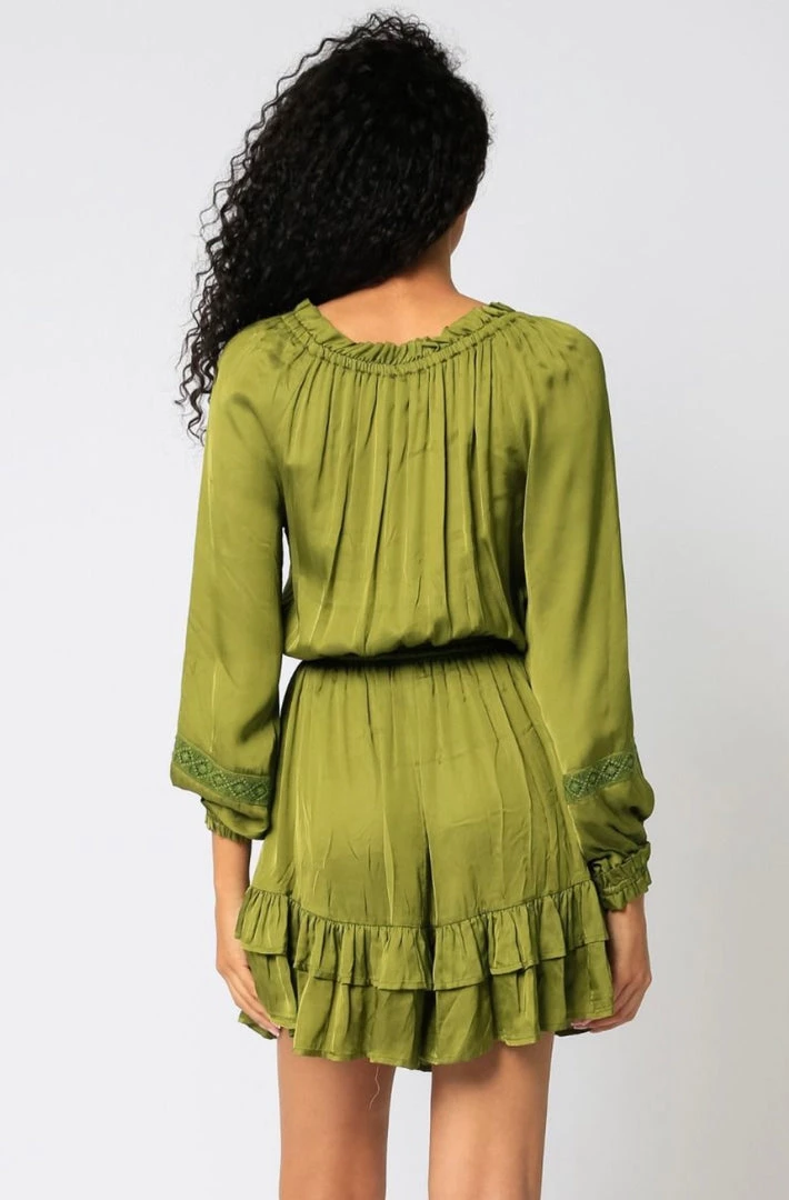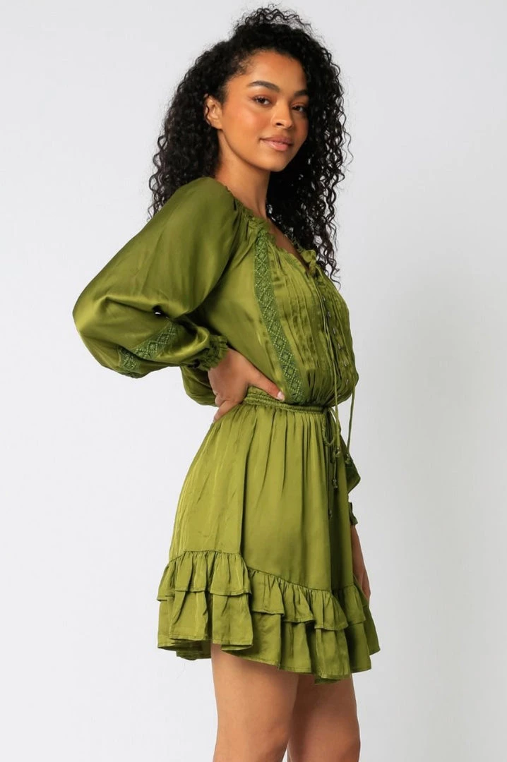 This Olivaceous Satin Ruffled Mini Dress features off or on shoulders and a drawstring waist.