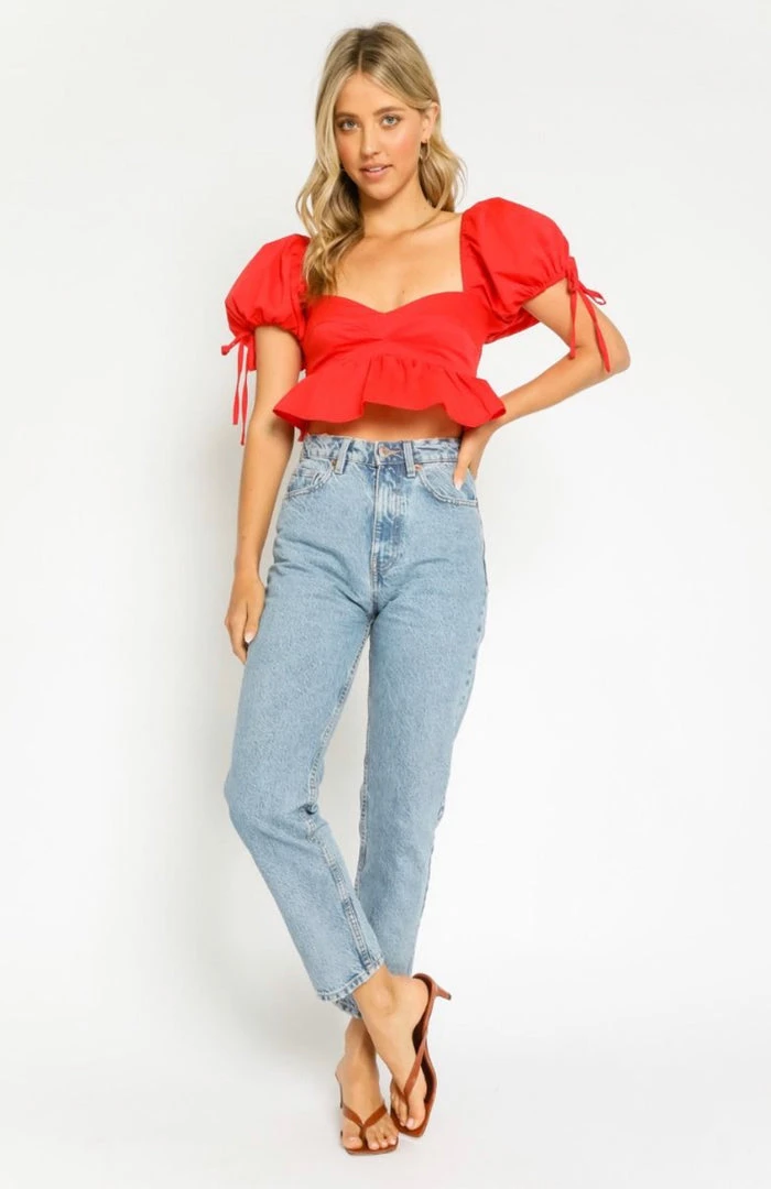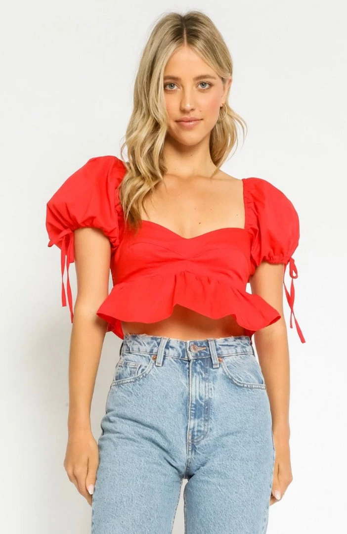 This Olivaceous Puff Sleeve Babydoll Top features a cropped hem and sweetheart bust.