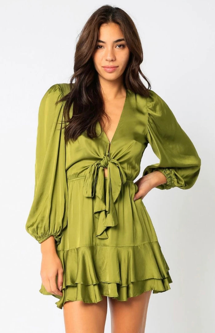 This Olivaceous Satin Waist Tie Dress features a ruffled hem and puff sleeves.