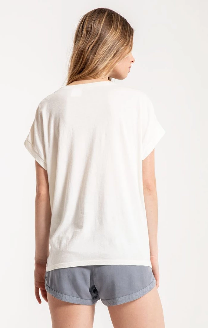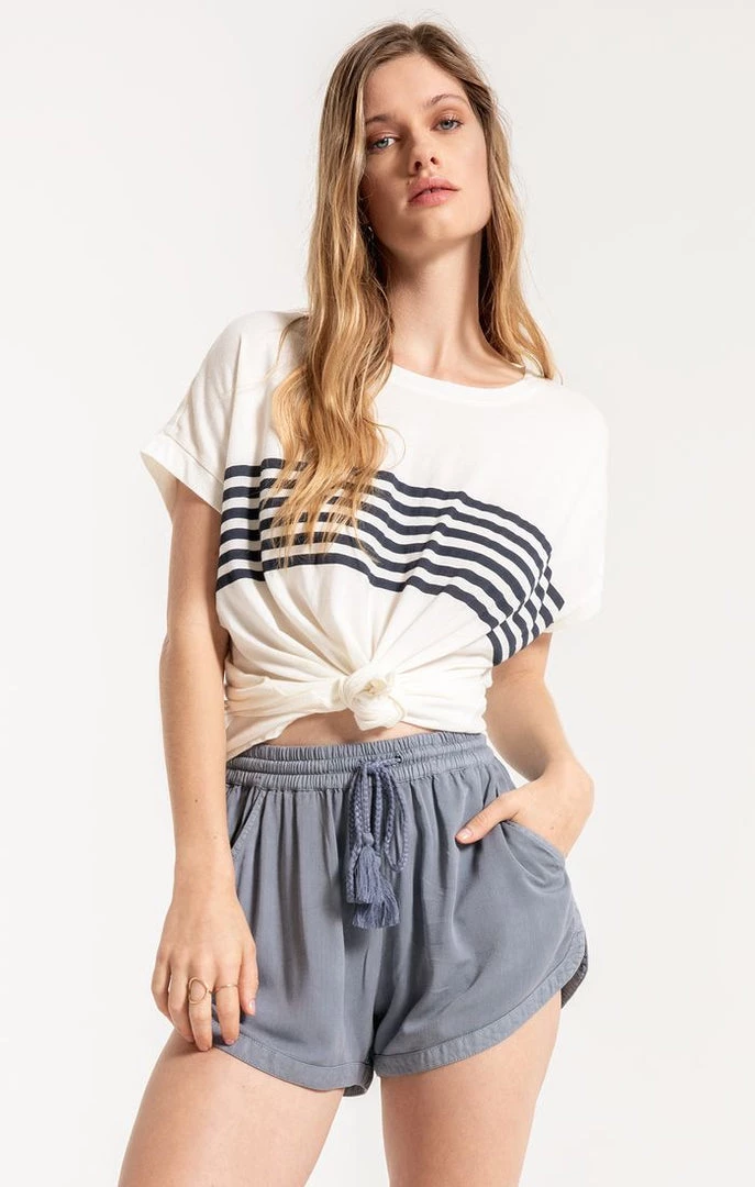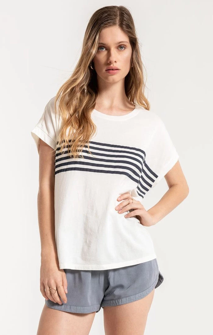 Crew neck tee with navy striped front detail. Fits true to size.