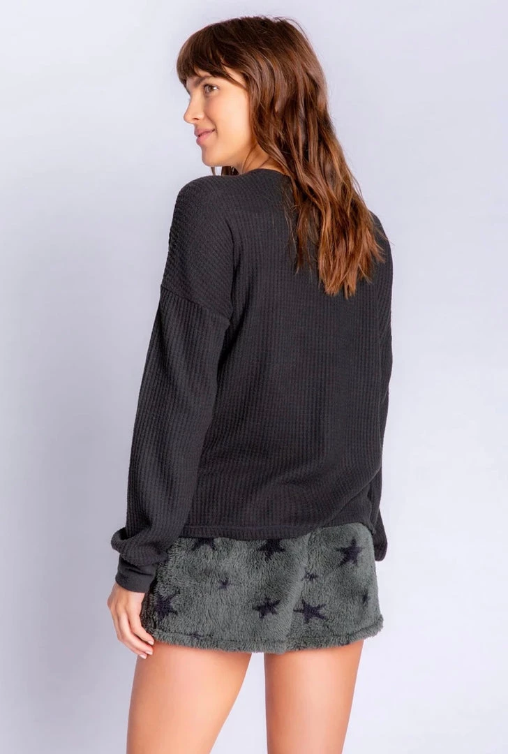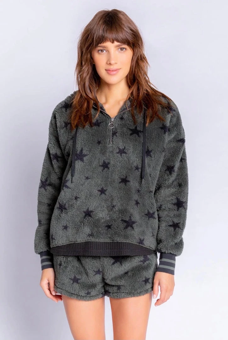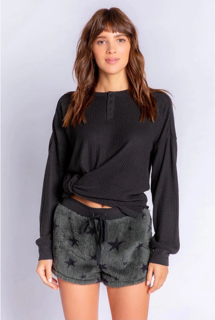 Cozy is part of our DNA and we love a good cozy-plush short. A fun, plush short in olive-black star print and a rib waistband. Pair with a set of our fun socks for an inspired lounge look.