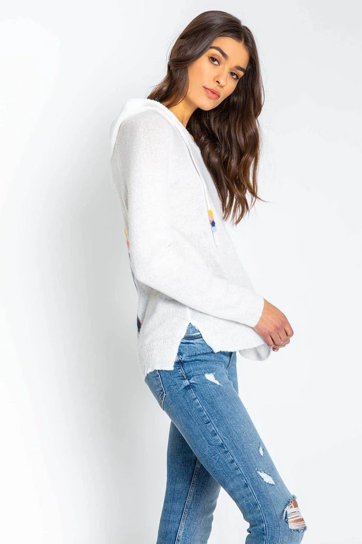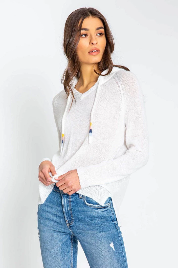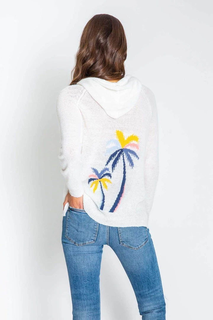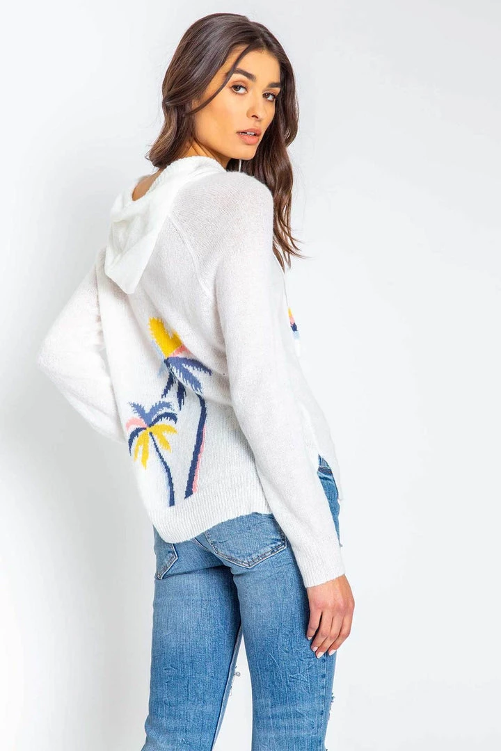DESCRIPTION: Knit summer sweater with boho vibe. Notched neckline with tipped drawcord detail. Oversized tropical back graphic print.