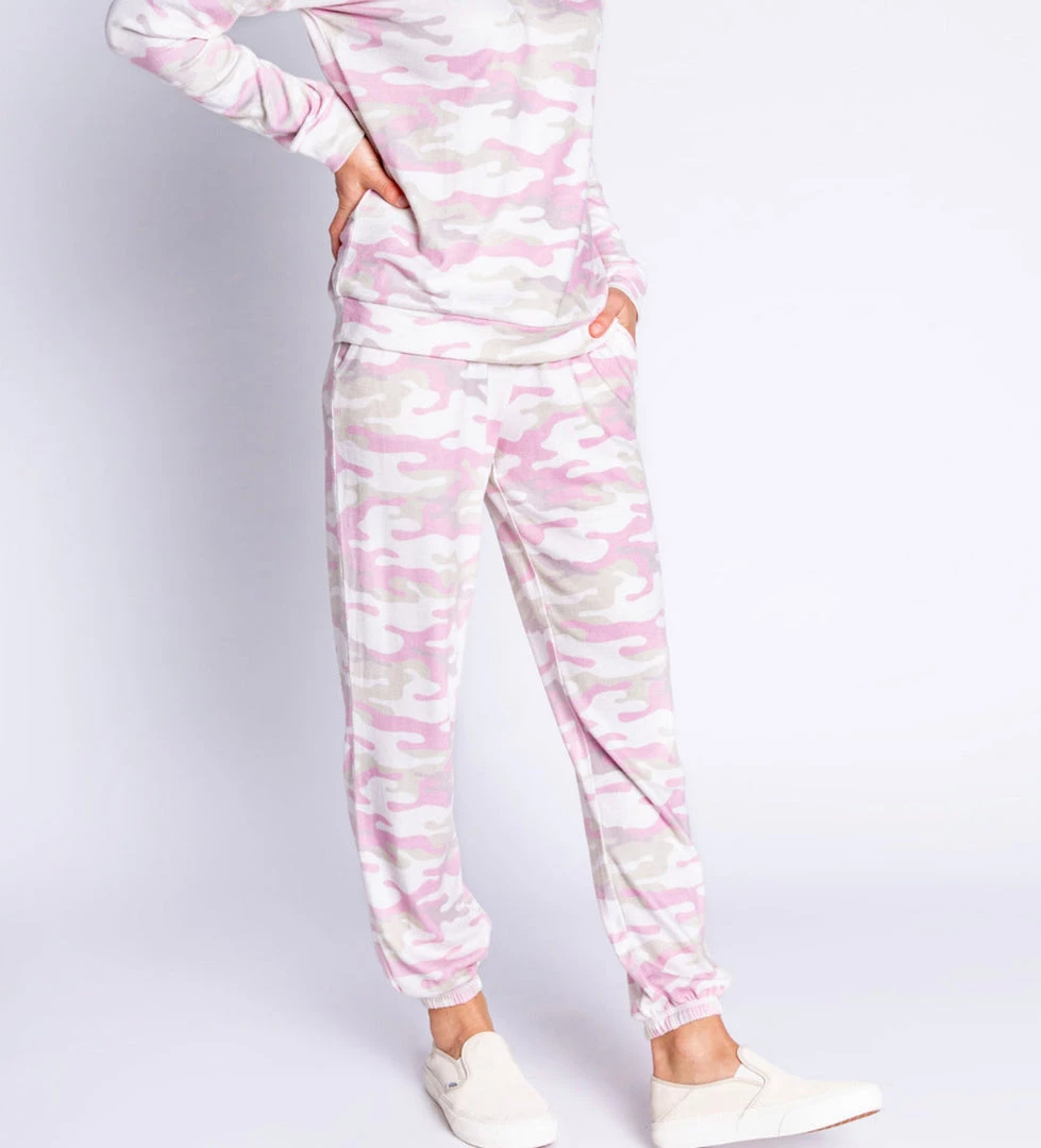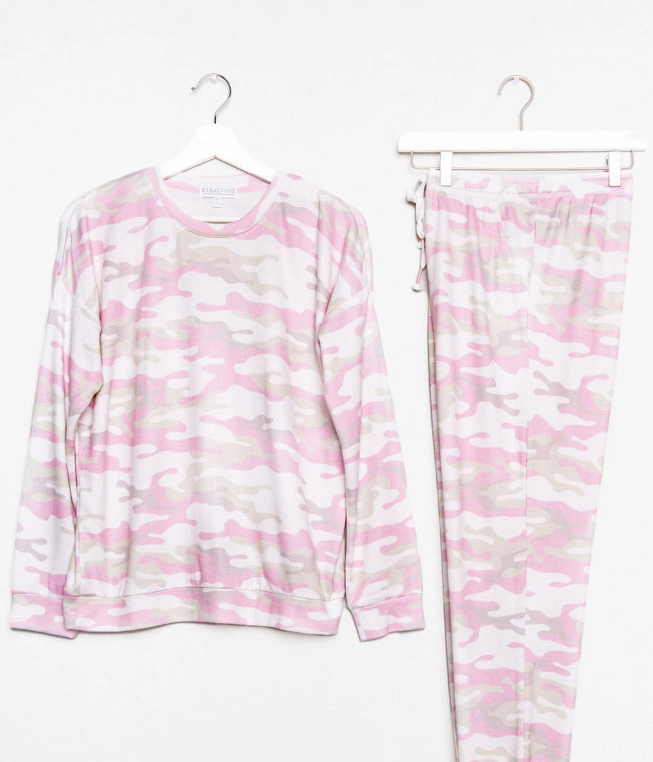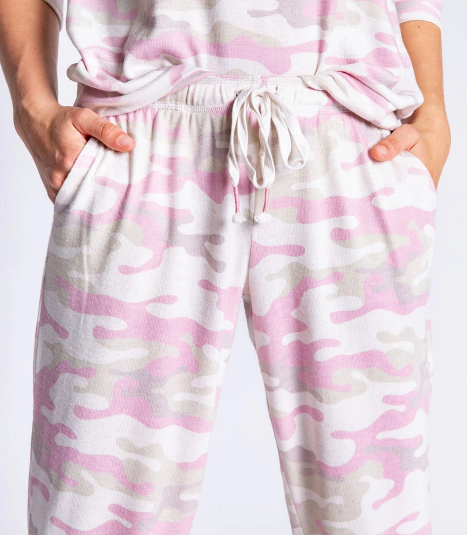 When the look calls for head-to-toe camo, in the most understated way. We love the pale sand & pink shades of this printed jogger pant & easy-fit lounge top.