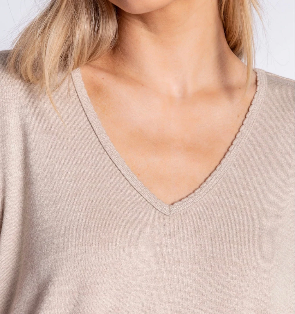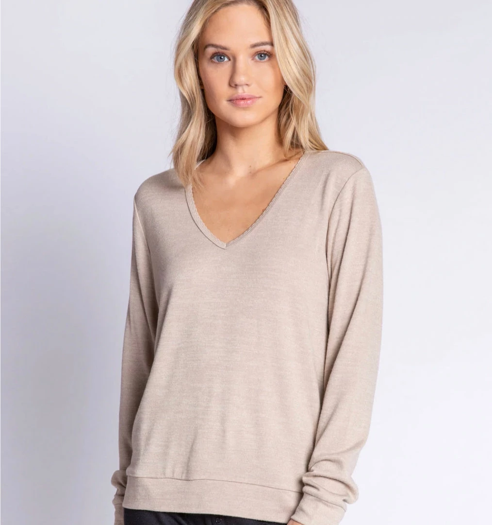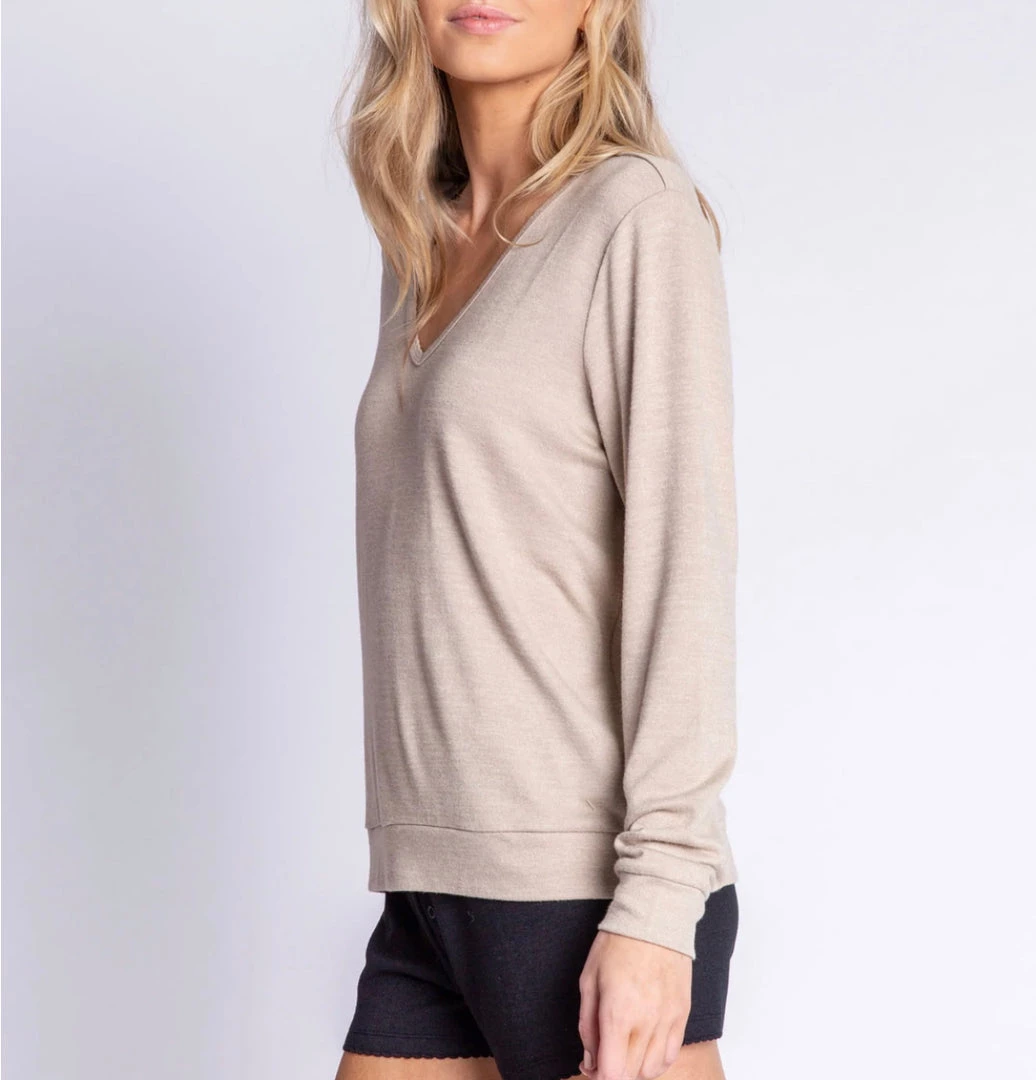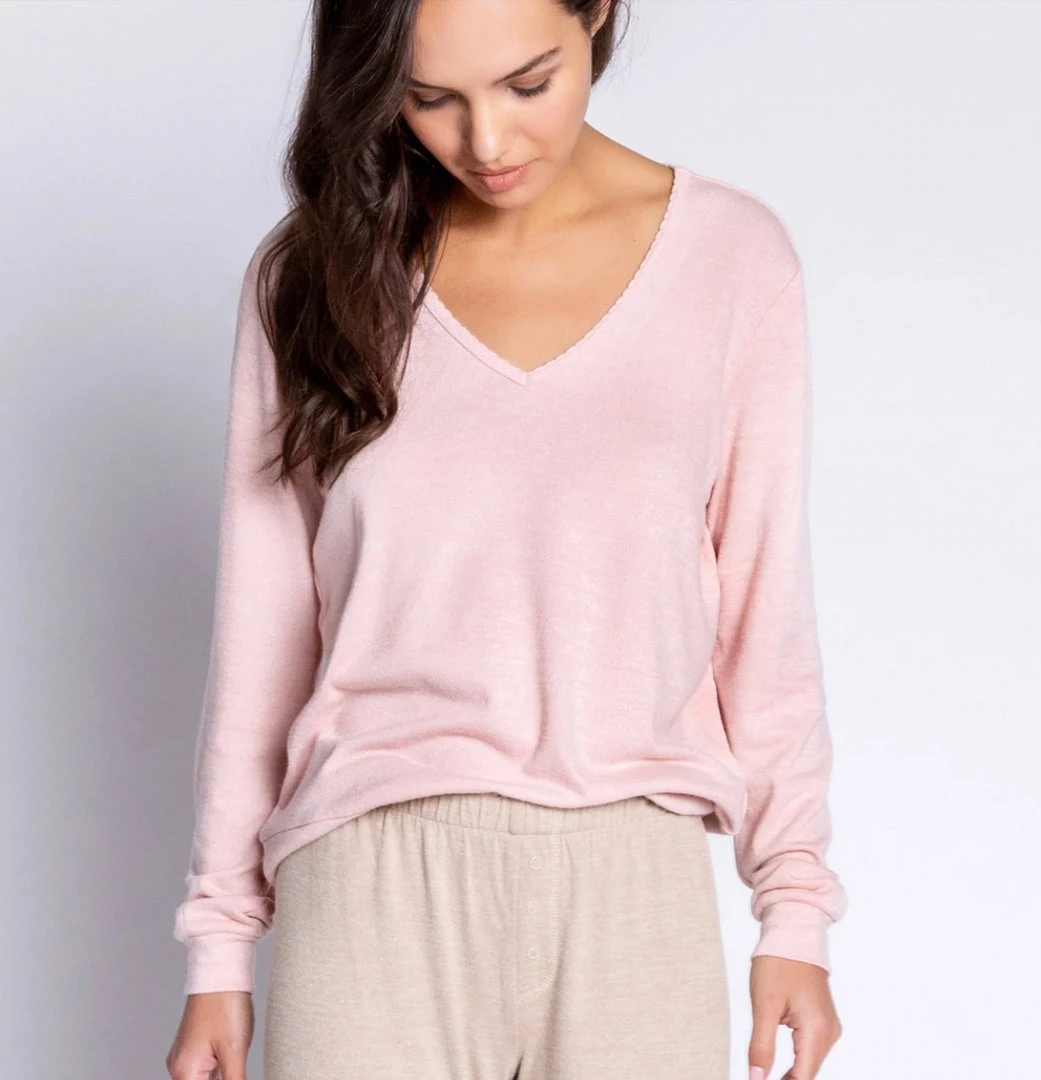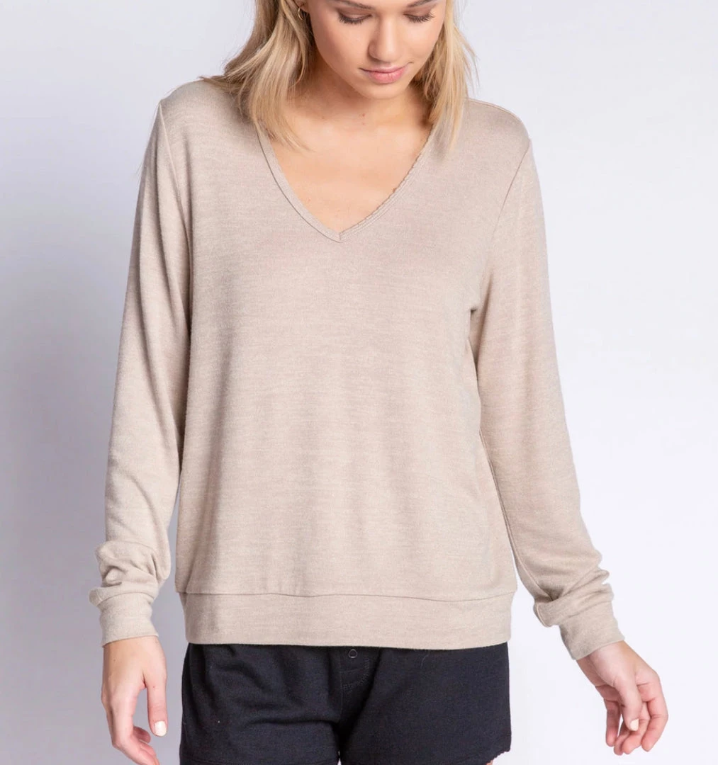 DESCRIPTION: Our favorite V-neck top…now even better. Made with REPREVE® certified recycled fabric (made from recycled plastics), this soft & modern black long sleeve top makes you feel good on the inside and outside! Care tip: turn inside out before wash to minimize pilling.