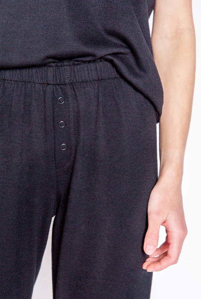 The ultimate lounge pant in this season’s best-selling sustainable collection from P.J. Salvage! Their flattering lounge pant in REPREVE® certified recycled fabric (made from recycled plastics), with an amazing, ultra-fine textured jersey knit with a soft, slightly silky hand. The lounge pant has a flattering, baby-gathered waist with 3-mini faux snaps at fly and a comfy straight leg.