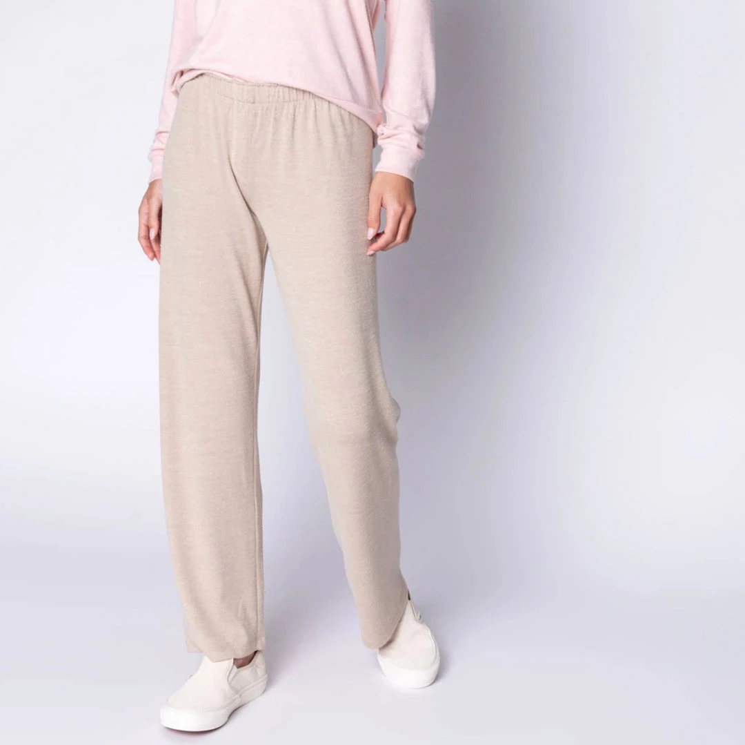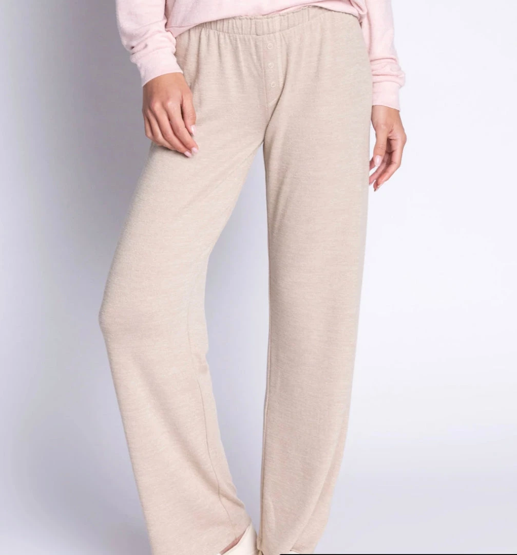 DESCRIPTION: Lounge pants that are eco-concious! What’s better? Lounge in these soft, knit pants made with REPREVE® certified recycled fabric (made from recycled plastics). A flattering, baby-gathered waist with 3-mini faux snaps at fly and a comfy straight leg, makes these pants a go-to in your closet.Care tip: turn inside out before wash to minimize pilling.
