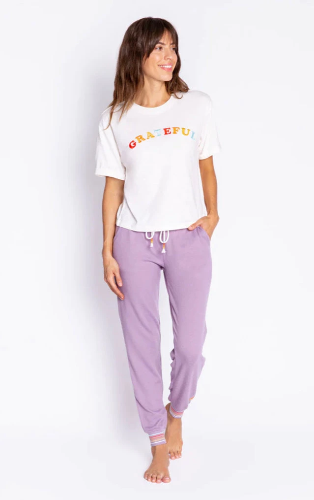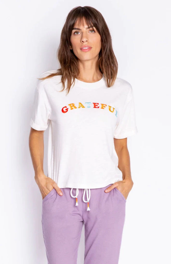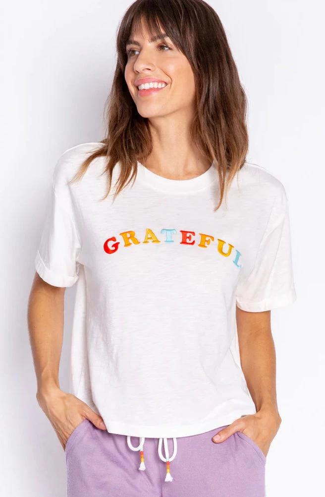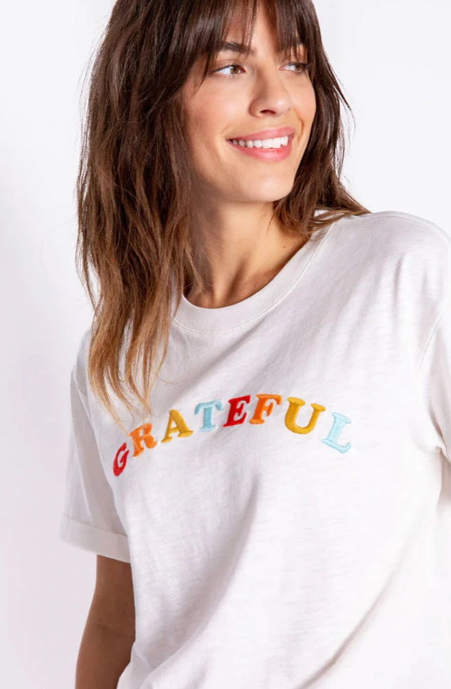 A friendly reminder to feel GRATEFUL today. Pull on this comfy cotton-blend tee anytime you need a mood lift, or want to inspire others. Embroidered front graphic.