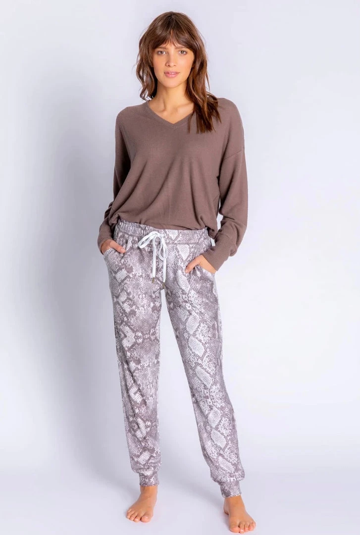 What do you get when you mix sweater weather with a trending print of the season? Snakebite! Our feather knit jogger is printed with a luxe snakeskin print for your ultimate statement pant. Dress it up or wear it with a low-key tee.