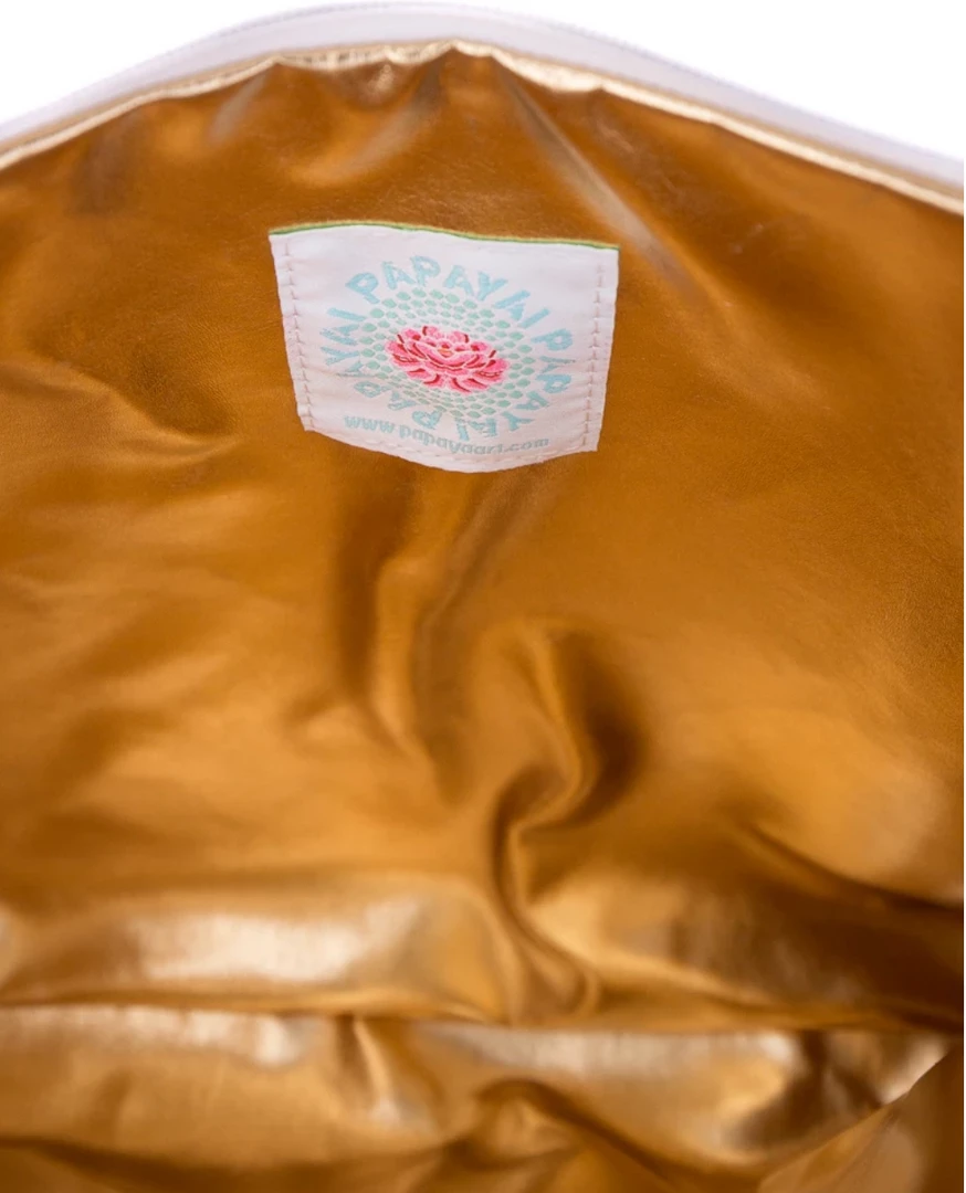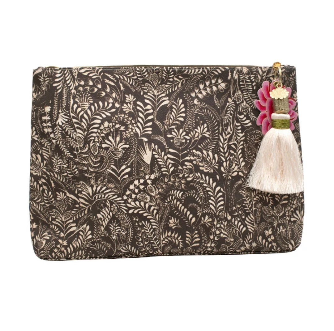 PAPAYA’s Living Woman Tassel Pouches are a vibrant, chic women’s clutch illustrated with delicate leaf brushstrokes on a soft black. Durable enough to use for organizing your beauty products, cosmetics, toiletries, art supplies and overnight must-haves or perfect for a glamorous night out on the town. A unique, boho gift for bridal showers, weddings, office parties, birthdays, Mother’s Day and more.