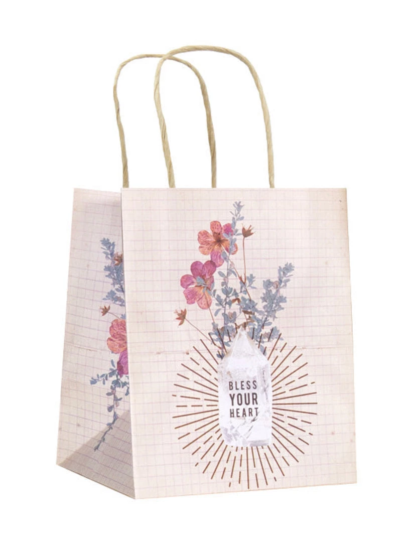PAPAYA’s Bless Your Heart all occasion Mini Gift Bag is illustrated with delicate hand pressed florals and hand painted leaves; perfect for presenting those special, miniature gifts to your loved ones. Small but mighty, these adorable bags are a great way to package up party favors, pastries, and other giftable trinkets. Our all occasion bags make birthdays, showers, holidays, weddings and more that much more fulfilling.