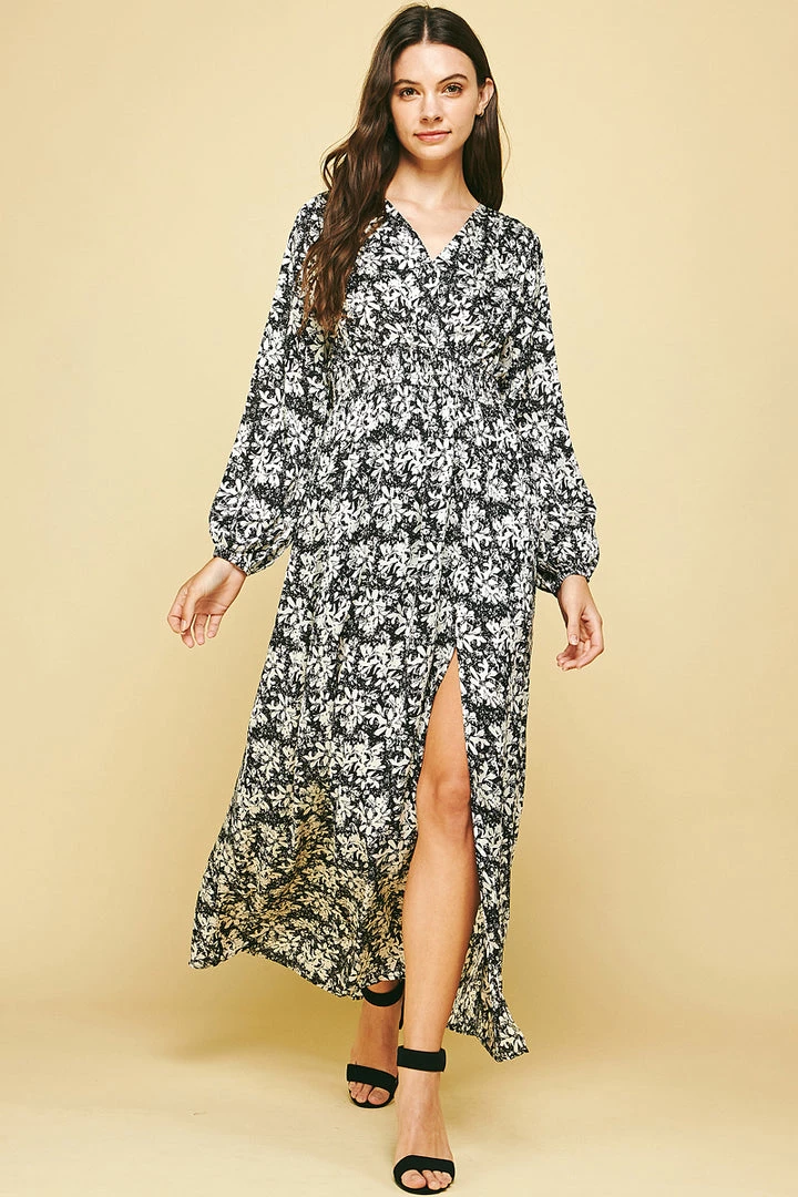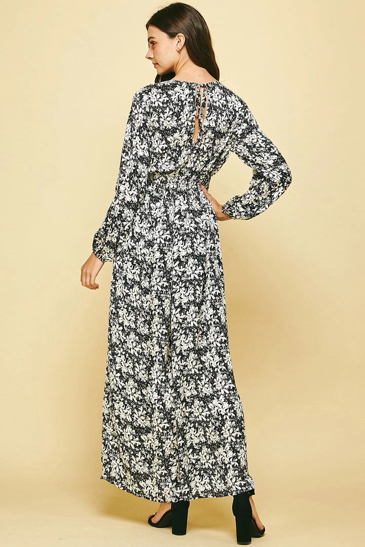 This Pinch dress has a supplication neckline, smocked waistband, a front slit and a lined bottom.