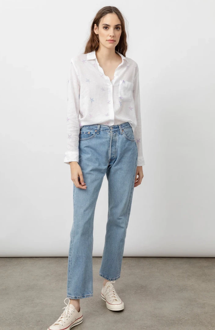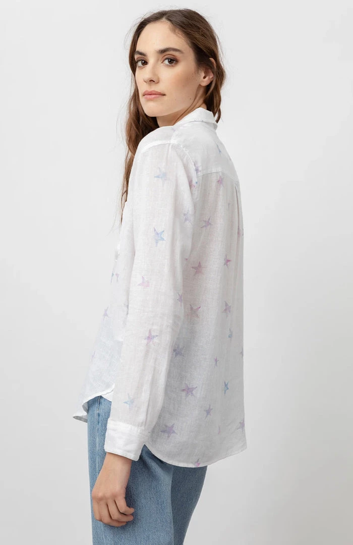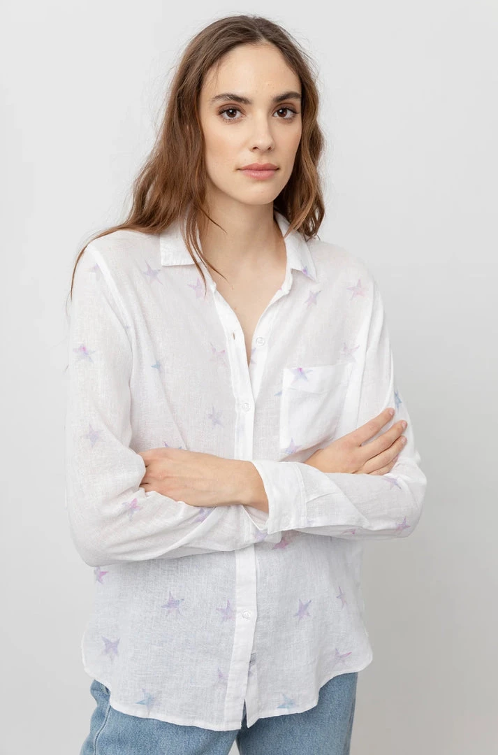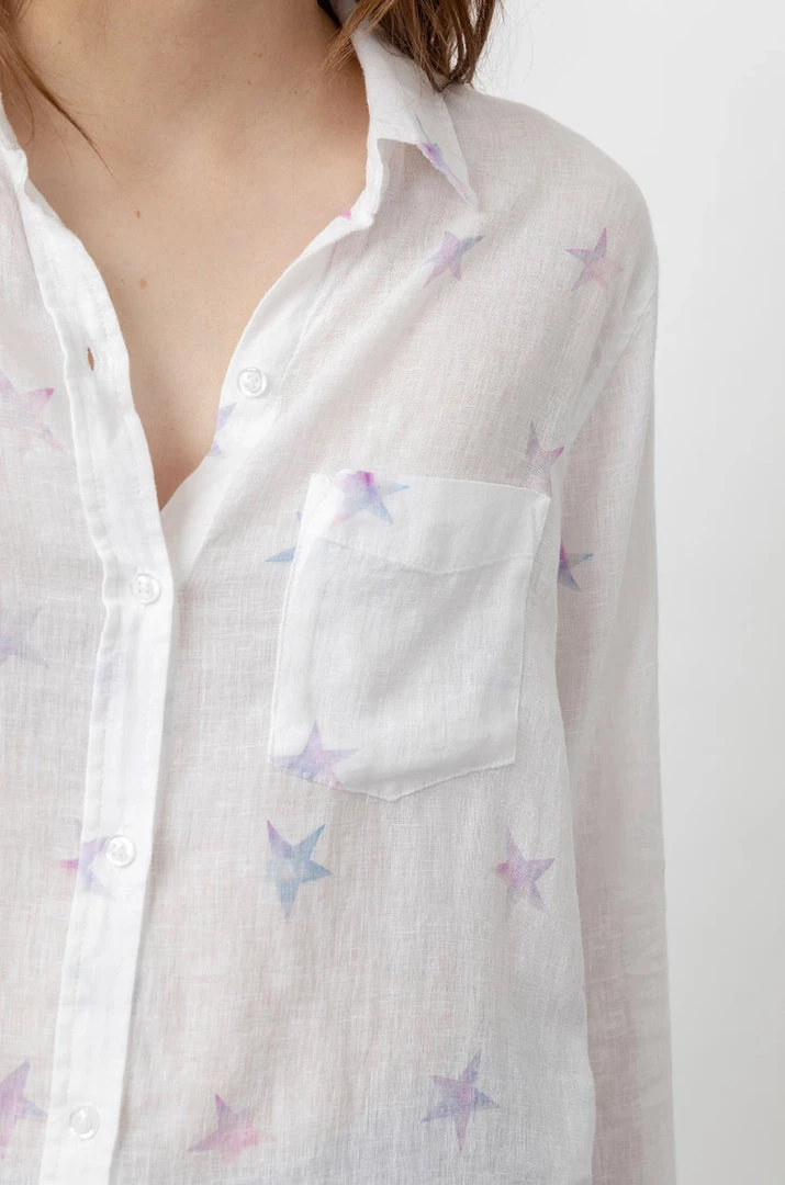 Luxe linen, long sleeve, crisp white buttondown shirt featuring multicolor tie dye star print throughout, relaxed fit, and patch pocket at chest. Lightweight, breezy linen fabric mixed with a relaxed body shape makes the Charli the perfect Southern California inspired buttondown.