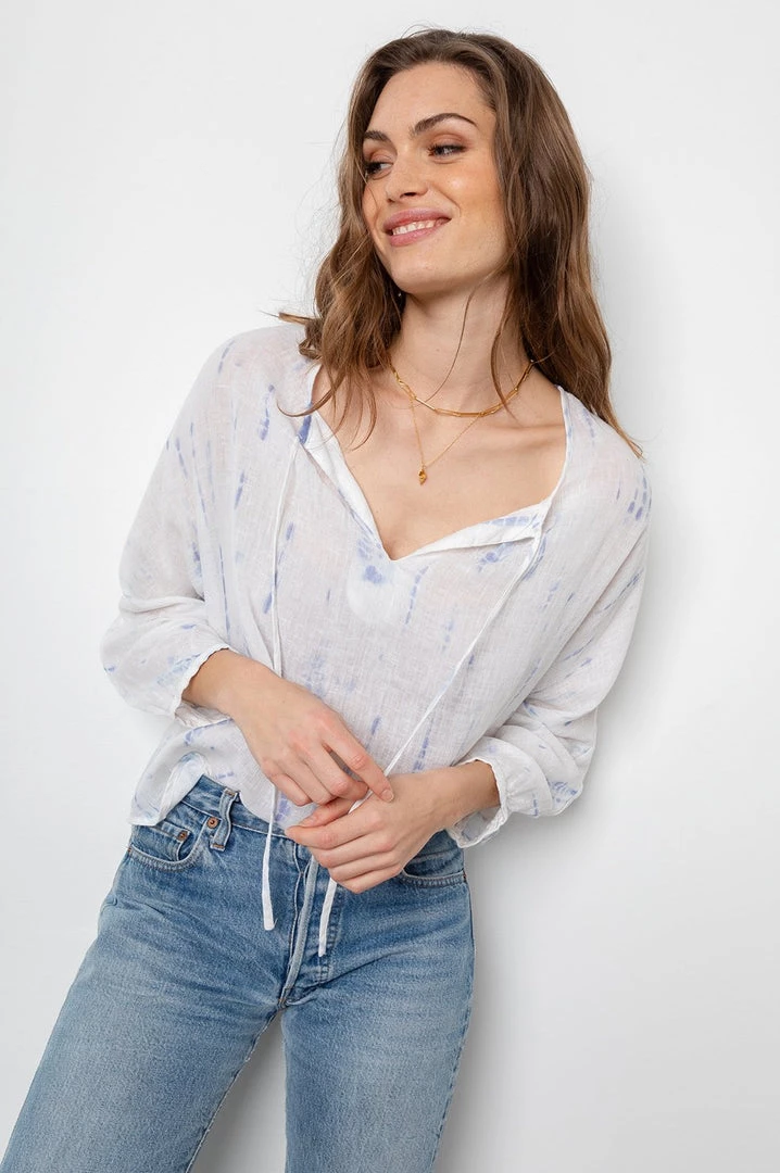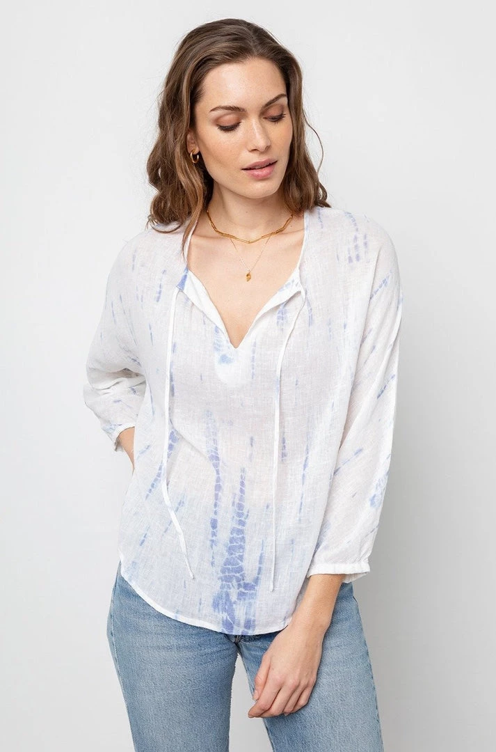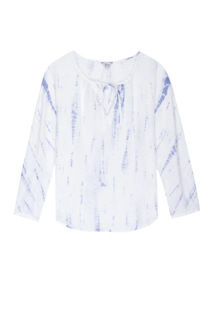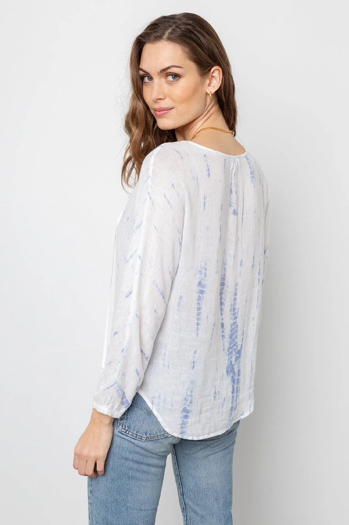 Long sleeve, lightweight linen, pullover relaxed fit blue tie dyed top featuring dolman sleeves, and V-neck neckline with self-tie closure detail.